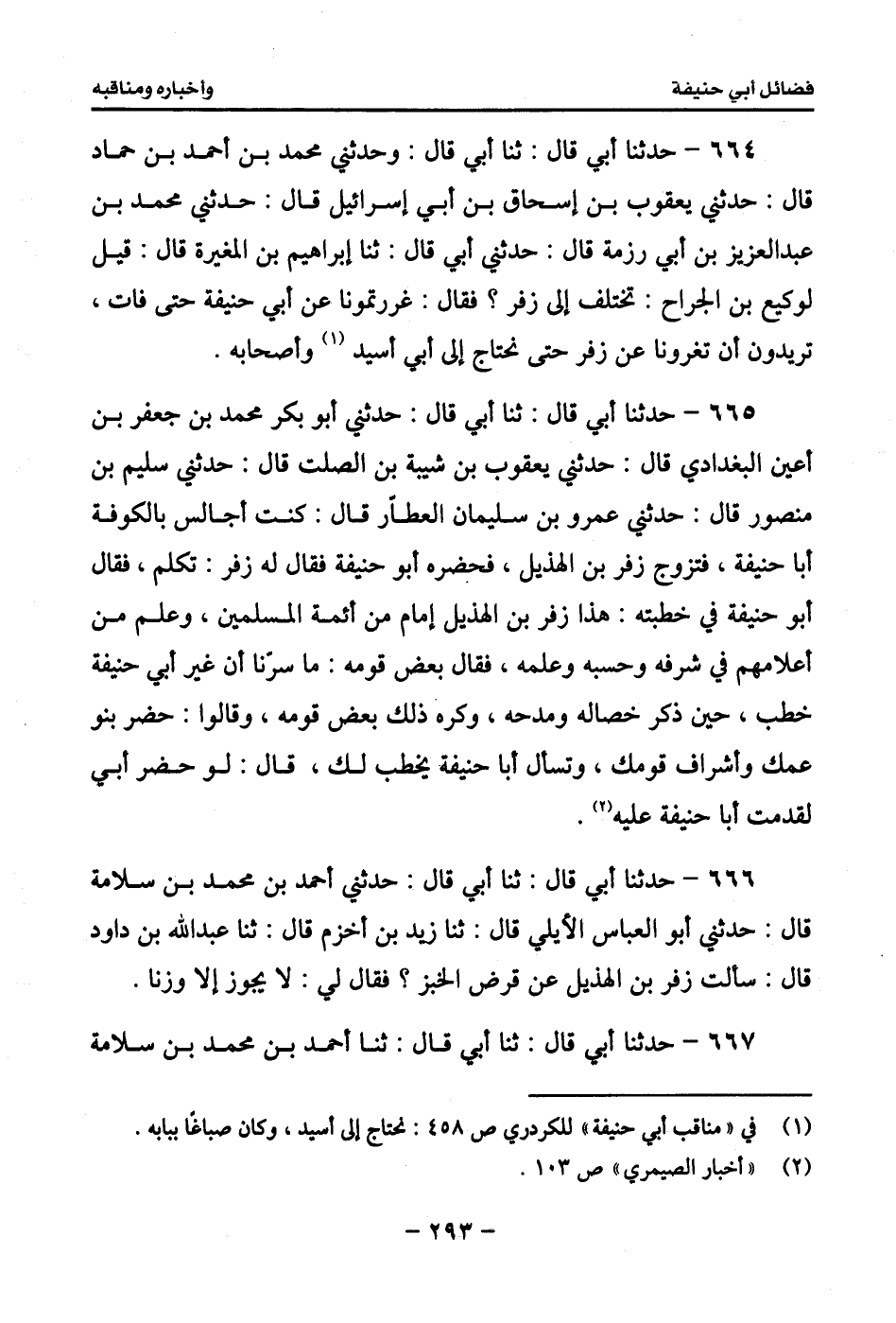 669 - حدثني أبي قال: حدثني أبي قال: حدثني محمد بن أحمد بن حماد قال: حدثني أحمد بن القاسم قال: حدثني أبو حفص المروزي قال: حدثني بشر بن يحيى، عن خالد بن صبيح قال: رحلت إلى أبي حنيفة فنعي إلي في الطريق فدخلت مسجد الكوفة فإذا الناس كلهم على زفر بن الهذيل، وعند أبي يوسف رجلان أو ثلاثة.