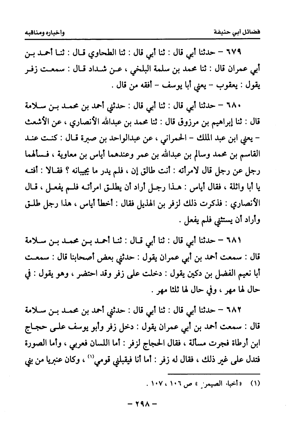 683 - حدثنا أبي قال: ثنا أبي قال: حدثني محمد بن أحمد بن حماد قال: سمعت أبا خازم القاضي يقول: قال لي بكر العمي: توفي زفر بن الهذيل في سنة ثمان وخمسين ومائة، وهو ابن ثمان وأربعين سنة.