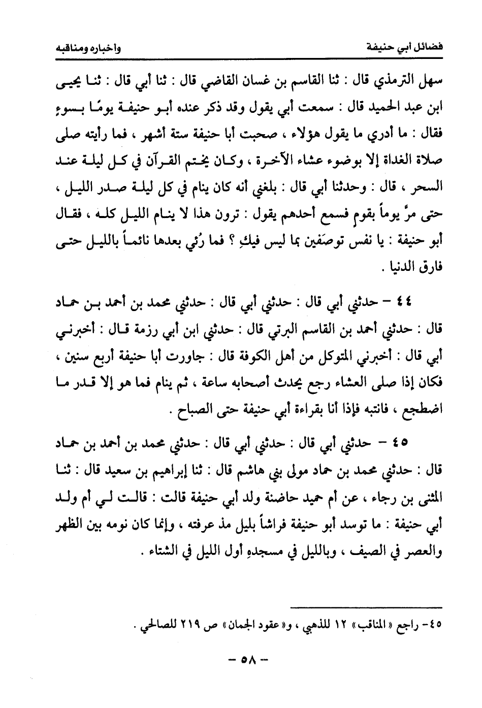 46 - حدثني أبي قال: حدثني أبي قال: سمعت أبا جعفر أحمد بن محمد ابن سلامة يقول: سمعت أبا عبد الرحمن العمري من ولد عمرو بن العاص يقول: سمعت أبا عبد الرحمن المقرئ يقول وذكر رجل عنده أبا حنيفة فقال: هل رأيته؟ قال: لا، قال: أما والله لو رأيته يصلي علمت أن الصلاة من همه.