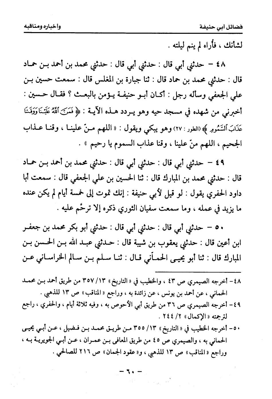 53 - حدثنا سعيد بن حماد قال: ثنا بكر العابد قال: قال أبو حنيفة: ((رب ارحمني وأنا صريع بين أهل الدنيا أعالج نفسي)).