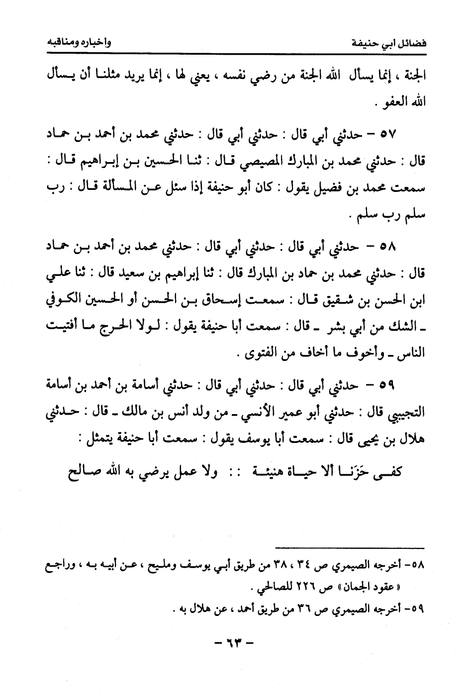 61 - حدثني أبي قال: حدثني أبي قال: حدثني محمد بن أحمد بن حماد قال: حدثني محمد بن حماد مولى بني هاشم قال: حدثني محمد بن مليح بن وكيع قال: ثنا يزيد بن كميت قال: سمعت أبا حنيفة وشتمه رجل، واستطال عليه، وقال له: يا كافر، يا زنديق، فقال أبو حنيفة: غفر الله لك هو يعلم مني #65# خلاف ما تقول، ما عدلت به أحداً مذ عرفته، ولا رجوت قط إلا عفوه، ولا خشيت إلا عقابه، ثم بكى عند ذكر العقاب حتى اختلج صدغاه وتحرك منكباه، فقام إليه الرجل فقال: اجعلني في حل -رحمك الله-، قال: نعم، أنت في حل وسعة، وكل من نسبني إلى ما تقول، يا أخي ما أضر الشهرة، يا أخي ما أضر الشهرة.