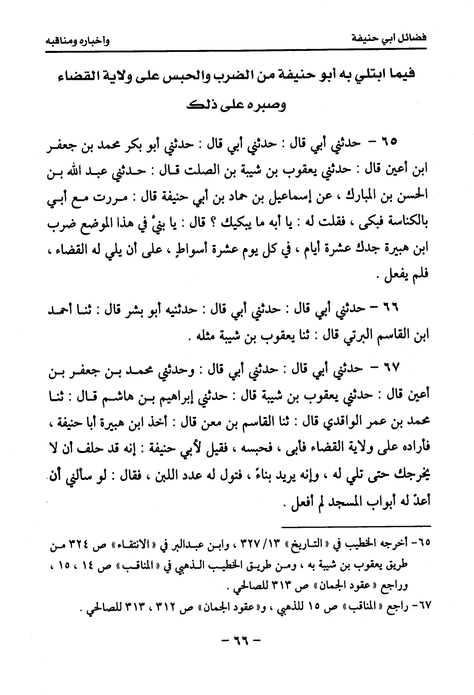69 - حدثني أبي قال: حدثني أبي قال: حدثني إبراهيم بن أحمد بن سهل الترمذي قال: ثنا القاسم بن غسان قاضي الكوفة قال: ثنا ابن شجاع قال: قال عبد الله بن المبارك: الرجال سواء ما لم تقع البلوى والمحن، لقد ابتلي أبو حنيفة بالضرب على رأسه بالسياط، على ما يناحر عليه غيره، وعرض عليه القضاء. فما أجاب، واحتمل ذلك في الله عز وجل وصبر عليه رحمه الله.