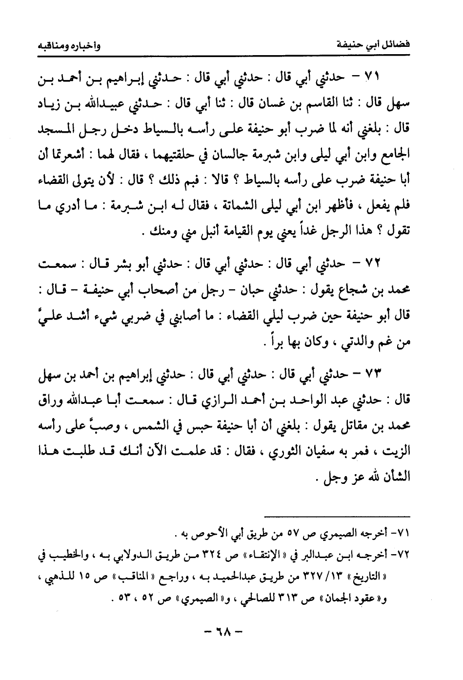 76 - حدثني أبي قال: حدثني أبي قال: حدثني محمد بن أحمد بن حماد #70# قال: حدثني يعقوب بن إسحاق بن أبي إسرائيل، عن يعقوب بن شيبة قال: حدثني عبد الله بن الحسن، عن بشر بن الوليد قال: لما أمر أبو جعفر المنصور بأبي حنيفة إلى الحبس دفع إلى أبي العباس، فأراد أبو العباس أن يتكلم أبو حنيفة بشيء يكون عليه فيه حجة، فقال له: يا شيخ إن أمير المؤمنين يأمر بدفع الرجل إليّ، وقد أمر فيه بالأمر من الضرب أو القطع أو القتل، ولا علم لي بقصته، أفيجوز لي أن أنفذ ما أمر به أمير المؤمنين وأنا لا أعلم ما حاله؟ فقال له أبو حنيفة: أمير المؤمنين يأمر بضرب رجل لا يجب عليه الضرب أم يجب ذلك عليه ويستحقه؟ ويأمر بقطع من لا يجب عليه القطع؟ ويقتل من لا يجب عليه القتل أو من يجب عليه القتل؟ فقال أبو العباس: أمير المؤمنين أبرّ وأتقى من أن يضرب أو يقطع أو يقتل من لا يجب ذلك عليه، فقال له أبو حنيفة: فإذا ضربت وقتلت وقطعت من يجب ذلك عليه ويستحقه فأنت في ذلك مأجور، فلم يجد عليه أبو العباس حجة، فلم يزل في الحبس حتى توفي فيه رحمه الله.