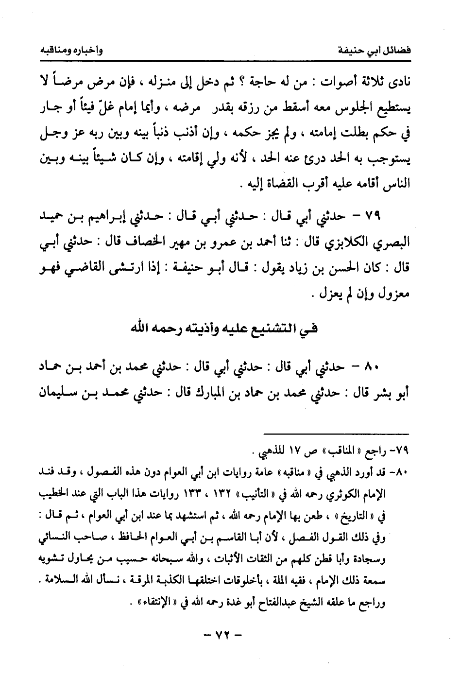 82 - حدثني أبي قال: حدثني أبي قال: حدثني محمد بن أحمد بن حماد قال: حدثني محمد بن المبارك قال: ثنا محمد بن سليمان قال: حدثني محمد بن الحسن الهمداني قال: سئل عبد السلام بن حرب الملائي عن أبي حنيفة: هل #74# استتيب؟ فقال: يغفر الله لك يا أخي، أستغفر الله من هذا، شُنّع عليه.