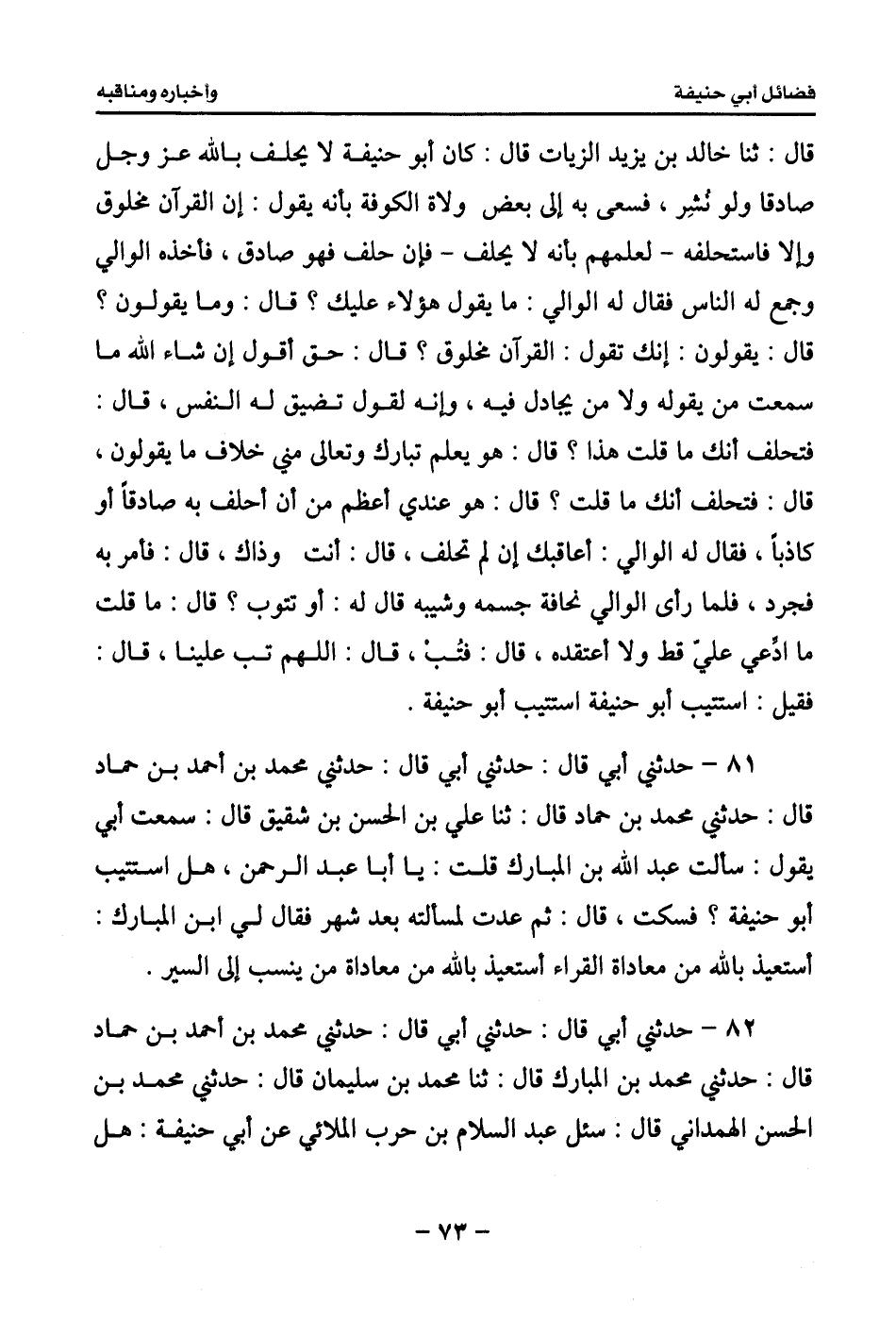 84 - حدثني أبي قال: حدثني أبي قال: وجدت في كتابي من حديث الحسن بن حماد سجادة، وقد حدثت به عنه قال: ثنا أبو قطن عمرو بن الهيثم قال: أردت الخروج إلى الكوفة فقلت لشعبة: من تكاتب بالكوفة؟ قال: أبو حنيفة وسفيان الثوري، فقلت: أكتب لي إليهما، فكتب، وصرت إلى الكوفة، فسألت عن أسن الرجلين؟ فقيل: أبو حنيفة، فدفعت إليه الكتاب، فقال: كيف أخي أبو بسطام؟ قلت بخير، فلما قرأ الكتاب قال: ما عندنا فلك مبذول، وما عند غيرنا فاستعن بنا نعينك، ومضيت إلى الثوري فدفعت إليه كتابه، فقال لي مثل ما قال أبو حنيفة، فقلت له، شيء يروى عنك تقول: إن أبا حنيفة استتيب من الكفر مرتين، أهو الكفر الذي هو ضد الإيمان؟ فقال: ما سألني عن هذه المسألة أحد غيرك منذ كلمت بها، وطأطأ رأسه ثم قال: لا، ولكن دخل واصل الشاري إلى الكوفة فجاء إليه جماعة فقالوا له: إن هاهنا رجلاً لا يكفر أهل المعاصي يعنون أبا حنيفة، فبعث فأحضره وقال: يا شيخ بلغني أنك لا تكفر أهل المعاصي؟ قال: هو مذهبي، قال: إن هذا كفر، فإن تبت قبلناك وإن أبيت قتلناك، قال: مم أتوب؟ قال: من هذا، قال: أنا تائب من الكفر، ثم خرج، فجاءت جماعة من أصحاب المنصور فأخرجت #75# واصلاً عن الكوفة، فلما كان بعد مدة وجد من المنصور خلوة فدخلها، فجاءت تلك الجماعة فقالت: إن الرجل الذي كان تاب قد راجع قوله، فبعث فأحضره فقال: يا شيخ بلغني أنك راجعت ما كنت تقول، فقال: وما هو؟ فقال: إنك لا تكفر أهل المعاصي، فقال: هو مذهبي، قال: فإن هذا عندنا كفر، فإن تبت منه قبلناك وإن أبيت قتلناك، قال: والشراة لا يقتلون حتى يستتاب ثلاث مرات، فقال: مم أتوب؟ قال: من الكفر، قال: فإني تائب من الكفر، قال: فهذا هو الكفر الذي استتيب منه.