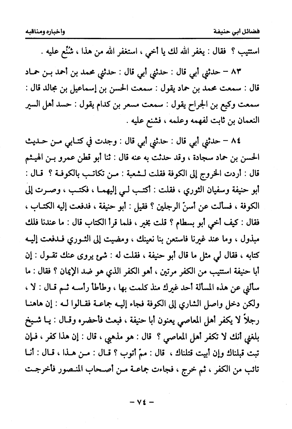85 - حدثني أبي قال: حدثني أبي قال: حدثني محمد بن أحمد بن حماد قال: حدثني أحمد بن القاسم البرتي قال: حدثني ابن أبي رزمة قال: سمعت أبا وهب قال: سمعت أبا يحيى قال: قلت للنضر بن محمد: أبو حنيفة كان يرى السيف؟ قال: معاذ الله.