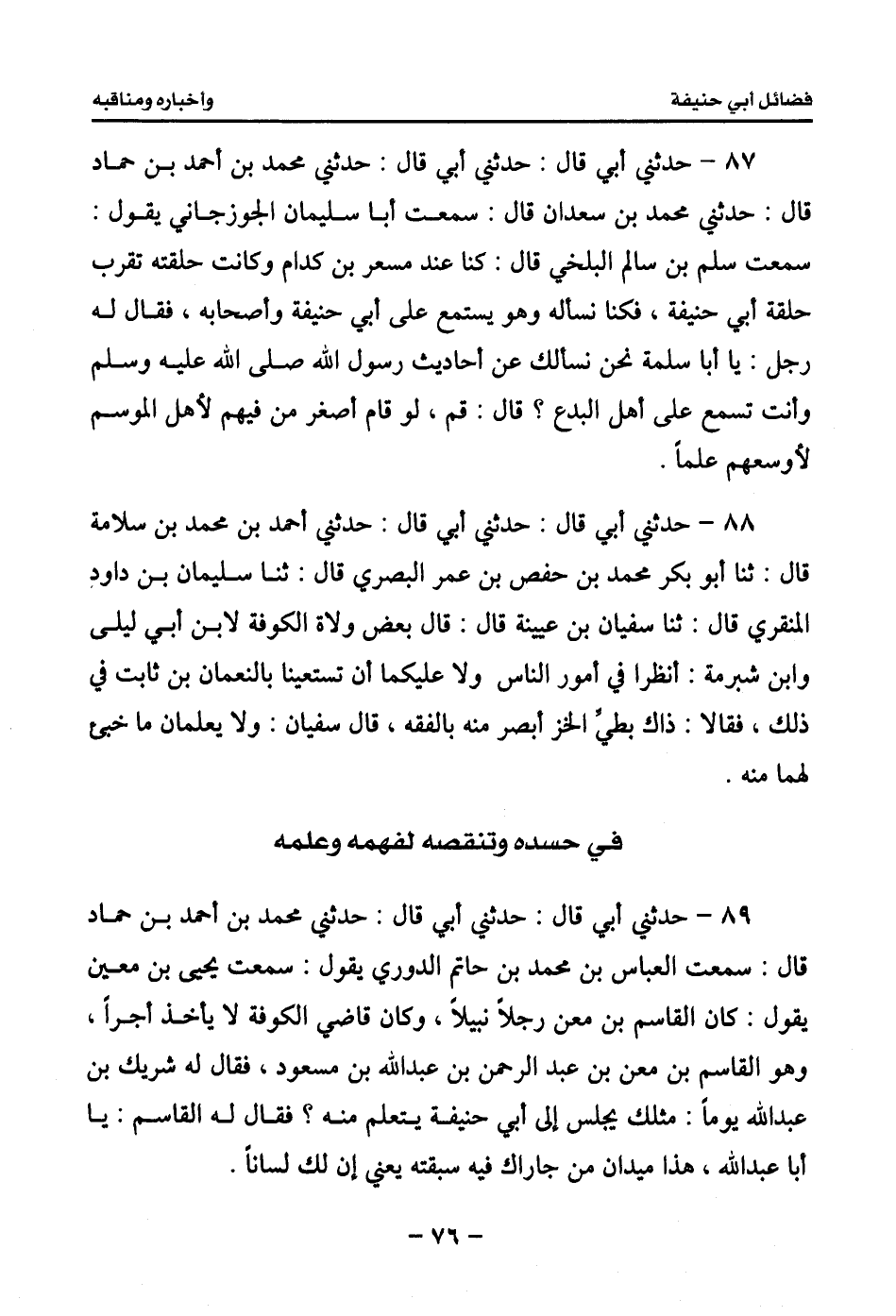 90 - حدثني أبي قال: حدثني أبي قال: حدثني أبو أحمد إبراهيم بن أحمد الترمذي قال: سمعت أبا نصر محمد بن محمد بن سلام البلخي قال: سمعت نصير بن يحيى البلخي يقول: قلت لأحمد بن حنبل: ما الذي نقمتم على هذا الرجل أعني أبا حنيفة؟ قال: الرأي، قال فقلت له: فهذا مالك بن أنس ألم يتكلم بالرأي؟ قال: نعم ولكن رأي أبي حنيفة خلد الكتب، فقلت: فقد خلد رأي مالك بن أنس الكتب، قال: أبو حنيفة أكثر رأياً منه، فقلت له: فهلاً تكلمتم في هذا بحصته وهذا بحصته، قال: فسكت.