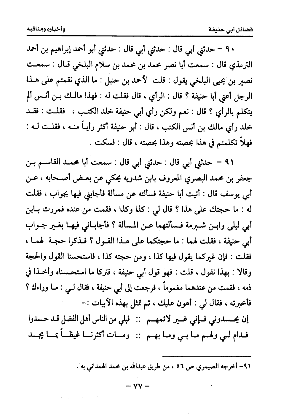 92 - حدثني أبي قال: حدثني أبي قال: حدثني أحمد بن محمد بن سلامة ابن سلمة الأزدي أبو جعفر قال: حدثني أبي محمد بن سلامة قال: ثنا عثمان ابن سعد البصري قال: كنا بباب أبي عاصم النبيل، فجرى ذكر أبي حنيفة، فمن محب مفرط ومن مبغض مفرط، فدخلت على أبي عاصم فقال لي: ما هذا اللغط؟ فقلت له: جرى ذكر أبي حنيفة فمن محب مفرط، ومن مبغض مفرط، فقال لي: ما هو والله إلا كما قال عبد الله بن قيس الرقيات: