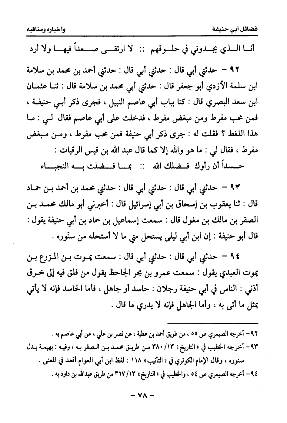 96 - حدثني أبي قال: حدثني أبي قال: حدثني أحمد بن محمد بن سلامة قال: ثنا بكار بن قتيبة القاضي قال: ثنا هلال بن يحيى قال: ثنا يوسف بن خالد السمتي قال: أتيت أبا حنيفة فاستأذنته في الرجوع إلى البصرة، وكان قد توفي بها من أهلي عدد كثير وتناسخت فيهم مناسخات حتى كدت أن لا أقف على مواريثهم لطول مقامي على أبي حنيفة، فقال لي: إنك تقدم على قوم لم يعنوا بالفقه عنايتك، فإن ذكرتني لهم سبوني، ولكن أذكر لهم أقوالي، فإذا ذكرتها استحسنوها ذكرتني لهم حينئذٍ.
