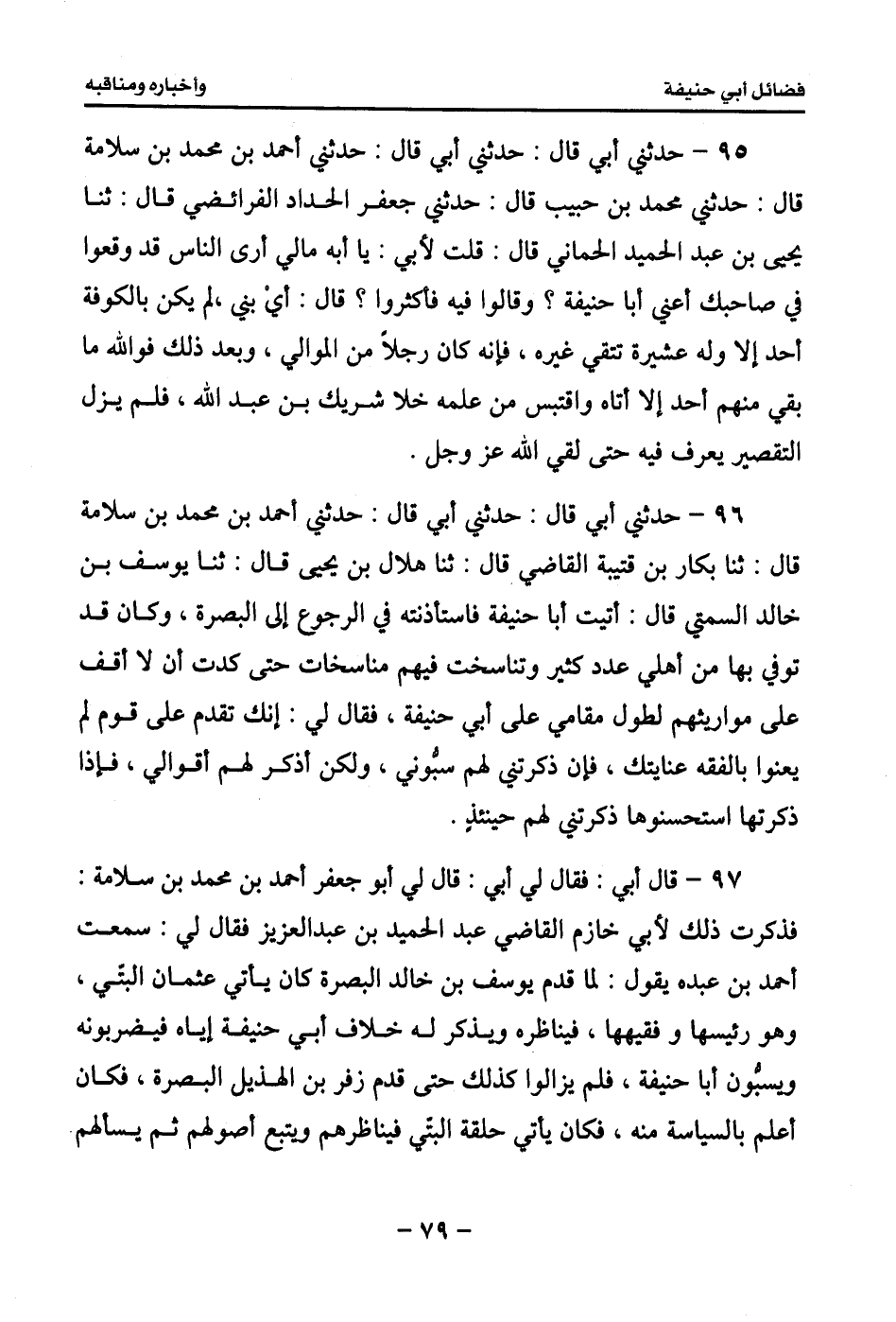 98 - حدثني أبي قال: حدثني أبي قال: حدثني أبو بشر الدولابي قال: ثنا محمد بن شجاع قال: سمعت محمد بن عبيد الطنافسي يقول: سمعت أبا معاوية الضرير يقول: ما زال سفيان الثوري يقدم عندنا حتى وقع في أبي حنيفة رحمهما الله.