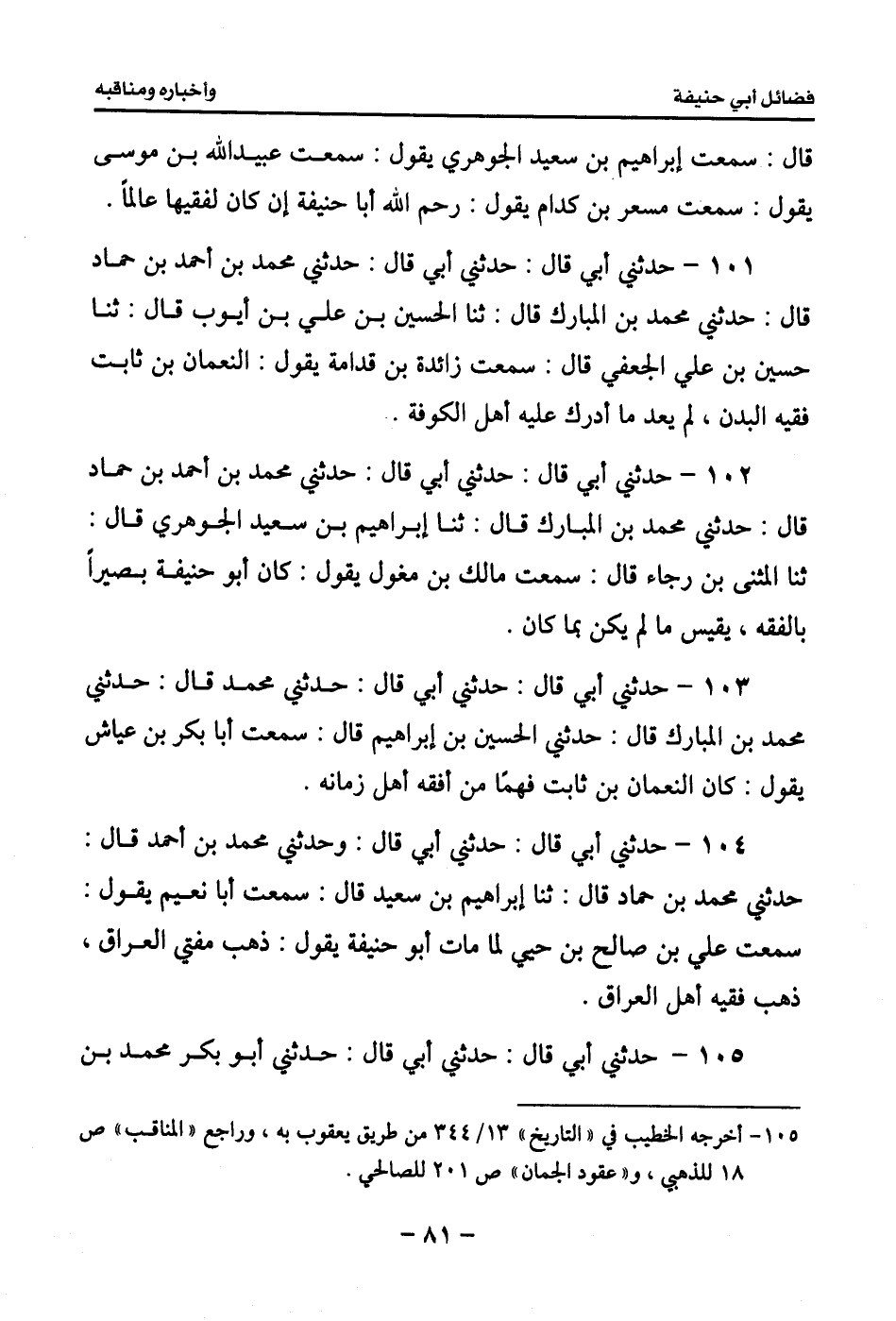 106 - حدثني أبي قال: حدثني أبي قال: حدثني محمد بن أحمد بن حماد قال: حدثني محمد بن شجاع قال: سمعت أبا عبد الرحمن المقرئ يقول: حدثني العالم الفقيه أبو حنيفة.
