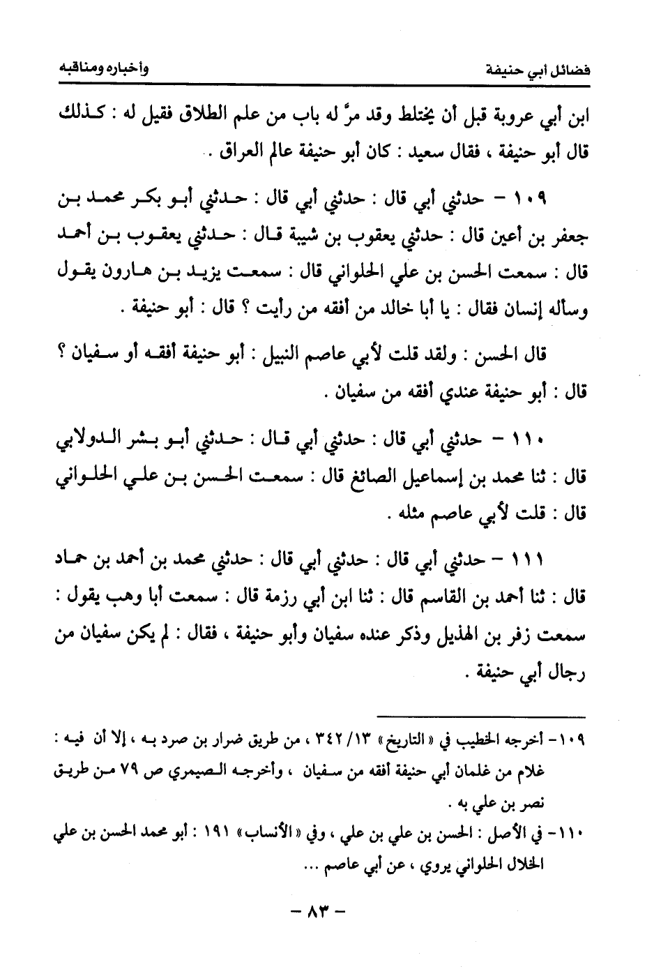 113 - حدثني أبي قال: حدثني أبي قال: حدثني محمد بن أحمد بن حماد قال: حدثني أحمد بن القاسم البرتي قال: حدثني أبو حفص المروزي قال: سمعت علي بن الحسن بن شقيق يقول: قال عبد الله بن المبارك: قول أبي حنيفة عندنا أثر إذا لم يكن فيه أثر.