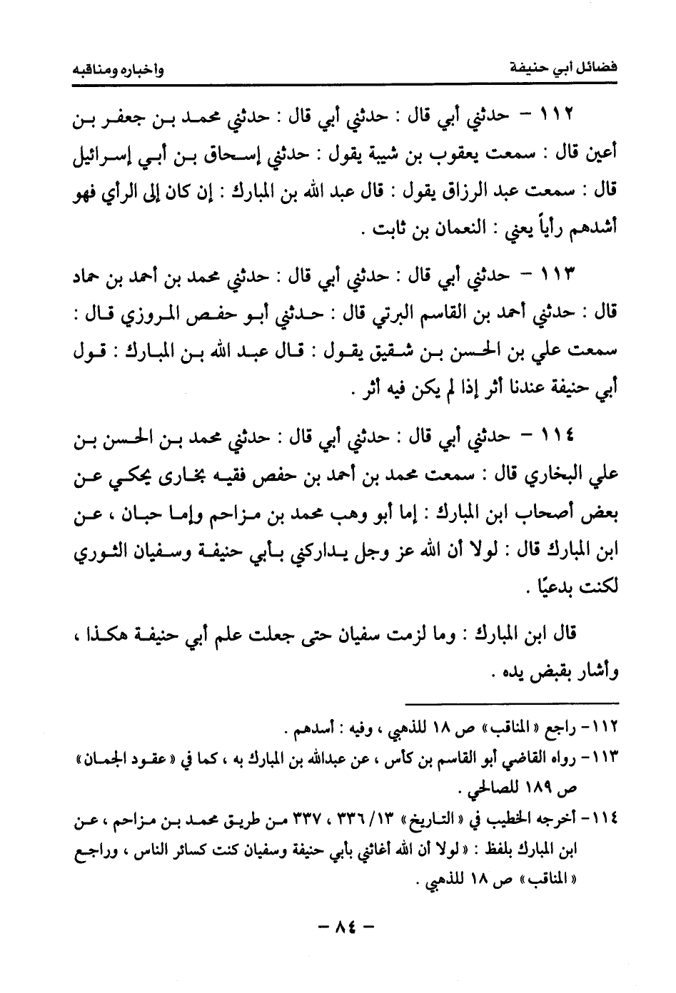 116 - حدثني أبي قال: حدثني أبي قال: حدثني محمد بن الحسن بن علي البخاري قال: ثنا الكشوري بصنعاء قال: ثنا أبو قدامة همام بن مسلمة قال: أنبأ عبد الرزاق قال: سمعت عبد الله بن المبارك يقول: إن كان لأحدٍ من هذه الأمة أن يقول بالرأي فهو لأبي حنيفة.