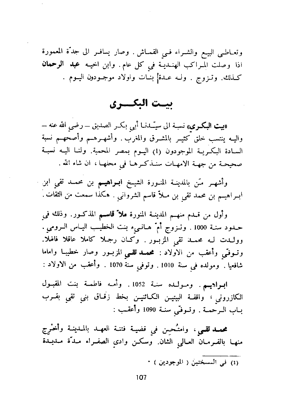 وأول من قدم منهم المدينة المنورة ملا قاسم المذكور. وذلك في حدود سنة 1000. وتزوج أم هانئ بنت الخطيب إلياس الرومي. وولدت له محمد تقي المزبور. وكان رجلاً كاملاً عاقلاً فاضلاً. وتوفي وأعقب من الأولاد: محمد تقي المزبور وصار خطيباً وإماماً شافعياً. ومولده في سنة 1010. وتوفي سنة 1070. وأعقب من الأولاد: إبراهيم. ومولده سنة 1052. وأمه فاطمة بنت المقبول الكازروني، واقفة البيتين الكائنين بخط زقاق بني تقي بقرب باب الرحمة. وتوفي سنة 1090 وأعقب: محمد تقي، وامتحن في قضية فتنة العهد بالمدينة وأخرج منها بالفرمان العالي الشان. وسكن وادي الصفراء مدة مديدة