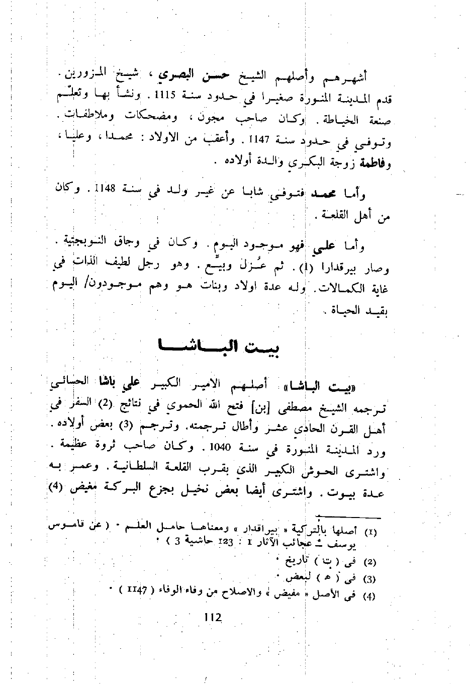" بيت الباشا " أصلهم الأمير الكبير علي باشا الحسائي ترجمة الشيخ مصطفى " بن " فتح الله الحموي في نتائج السفر في أهل القرن الحادي عشر وأطال ترجمته. وترجم بعض أولاده. ورد المدينة المنورة في سنة 1040. وكان صاحب ثروة عظيمة. واشترى الحوش الكبير الذي بقرب القلعة السلطانية. وعمر به عدة بيوت. واشترى أيضاً بعض نخيل بجزع البركة مغيض