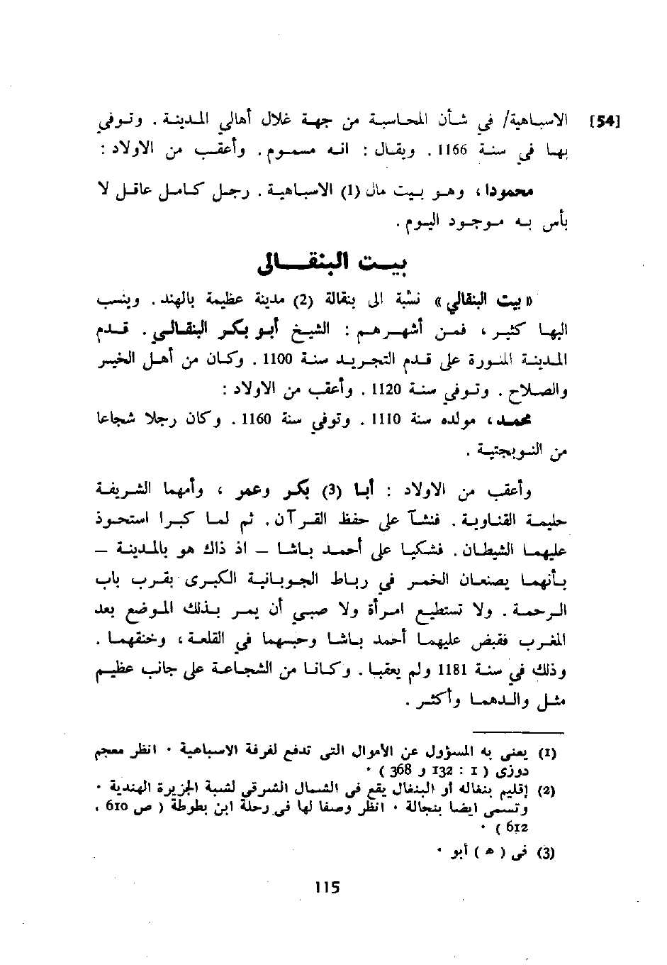 " بيت البنقالي " نسبة إلى بنقالة مدينة عظيمة بالهند. وينسب إليها كثير، فمن أشهرهم: الشيخ أبو بكر البنقالي. قدم المدينة المنورة على قدم التجريد سنة 1100. وكان من أهل الخير والصلاح. وتوفي سنة 1120. وأعقب من الأولاد: محمد، مولده سنة 1110. وتوفي سنة 1160. وكان رجلاً شجاعاً من النوبجتية.