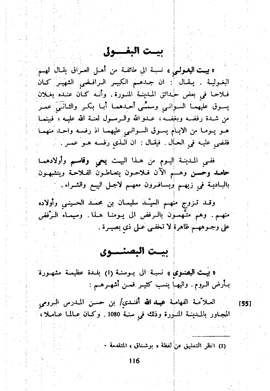 " بيت البصنوي " نسبة إلى بوسنة بلدة عظيمة مشهورة بأرض الروم. وإليها ينسب كثير فمن أشهرهم: العلامة الفهامة عبد الله أفندي بن حسن المدرس الرومي المجاور بالمدينة المنورة وذلك في سنة 1080. وكان عالماً عاملاً