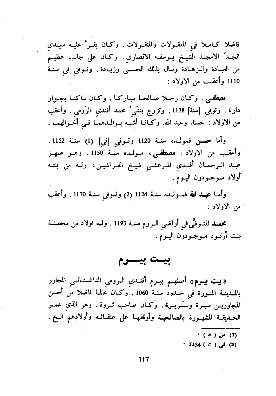 فاضلاً كاملاً في المعقولات والمنقولات. وكان يقرأ عليه سيدي الجد الأمجد الشيخ يوسف الأنصاري. وكان على جانب عظيم من العبادة والزهادة. ونال بذلك الحسنى وزيادة وتوفي في سنة 1110 وأعقب من الأولاد: مصطفى. وكان رجلاً صالحاً مباركاً. وكان ساكناً بجوار دارنا. وتوفي " سنة " 1138. وتزوج بنتي محمد أفندي الرومي. وأعقب من الأولاد حسناً، وعبد الله. وكانا أشبه بوالدهما في أخوالهما.