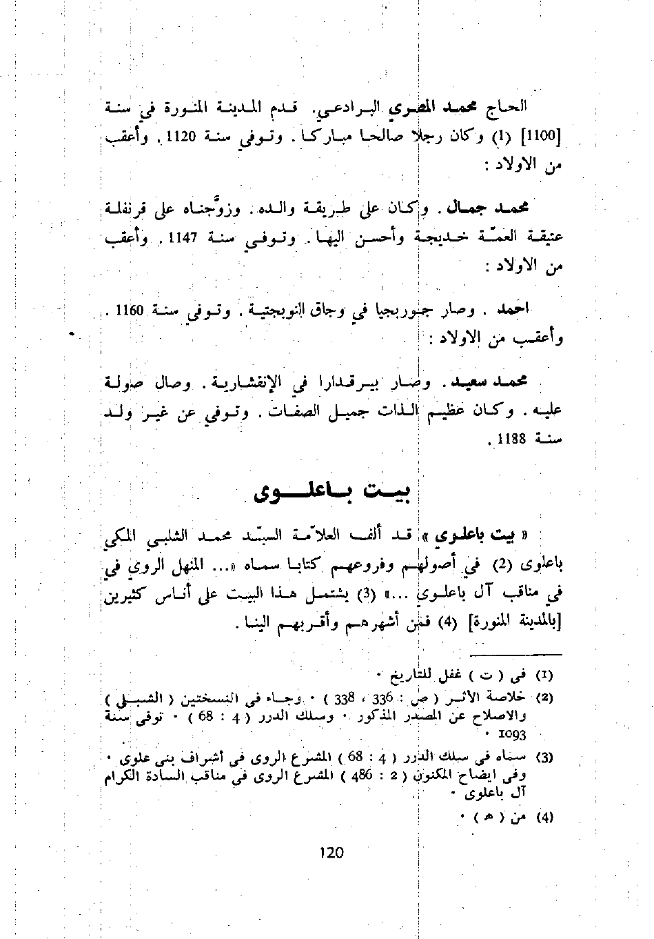 الحاج محمد المصري البرادعي. قدم المدينة المنورة في سنة " 1100 " وكان رجلاً صالحاً مباركاً. وتوفي سنة 1120. وأعقب من الأولاد: محمد جمال. وكان على طريقة والده. وزوجناه على قرنفلة عتيقة العمة خديجة وأحسن إليها. وتوفي سنة 1147. وأعقب من الأولاد: أحمد. وصار جوربجياً في وجاق النوبجتية. وتوفي سنة 1160. وأعقب من الأولاد: محمد سعيد. وصار بيرقداراً في الإنقشارية. وصال صولة عليه. وكان عظيم الذات جميل الصفات. وتوفي عن غير ولد سنة 1188.