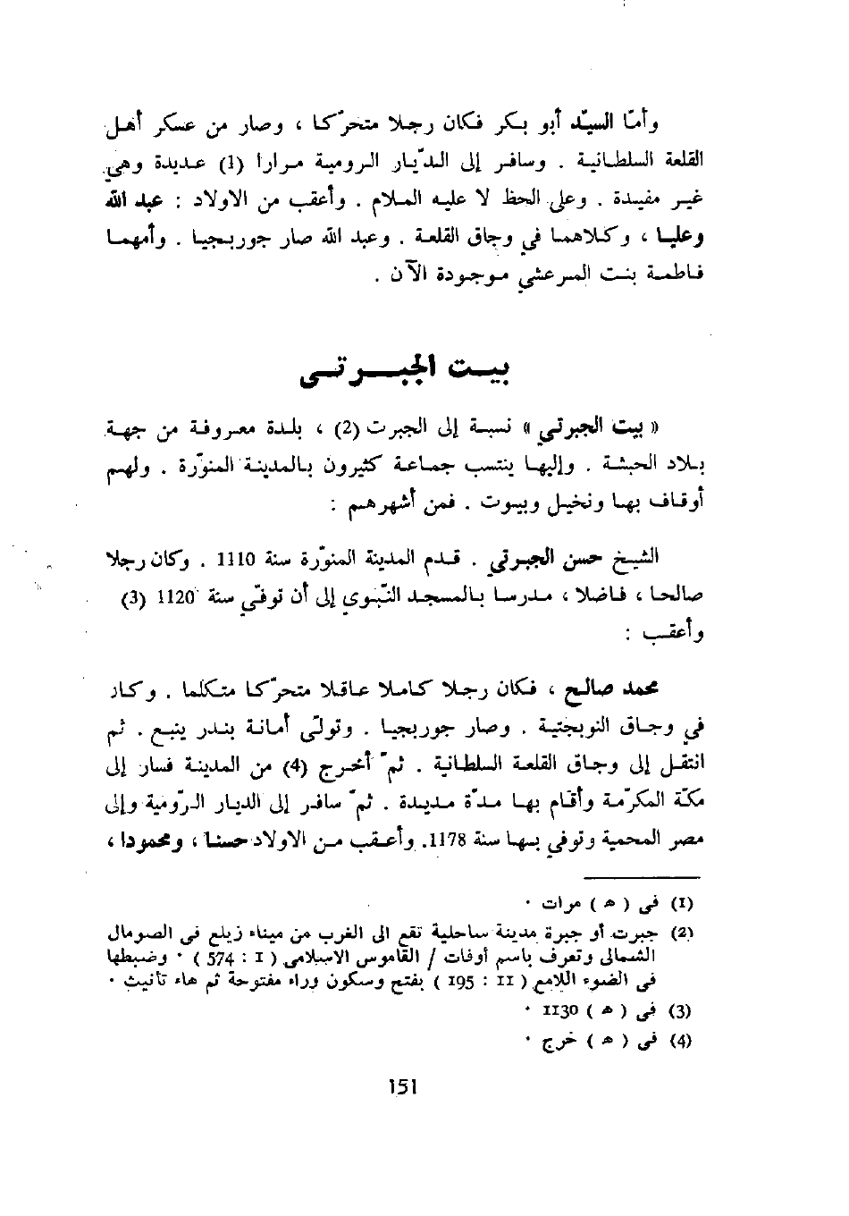 " بيت الجبرتي " نسبة إلى الجبرت، بلدة معروفة من جهة بلاد الحبشة. وإليها ينتسب جماعة كثيرون بالمدينة المنورة. ولهم أوقاف بها ونخيل وبيوت. فمن أشهرهم: الشيخ حسن الجبرتي. قدم المدينة المنورة سنة 1110. وكان رجلاً صالحاً، فاضلاً، مدرساً بالمسجد النبوي إلى أن توفي سنة 1120. وأعقب: