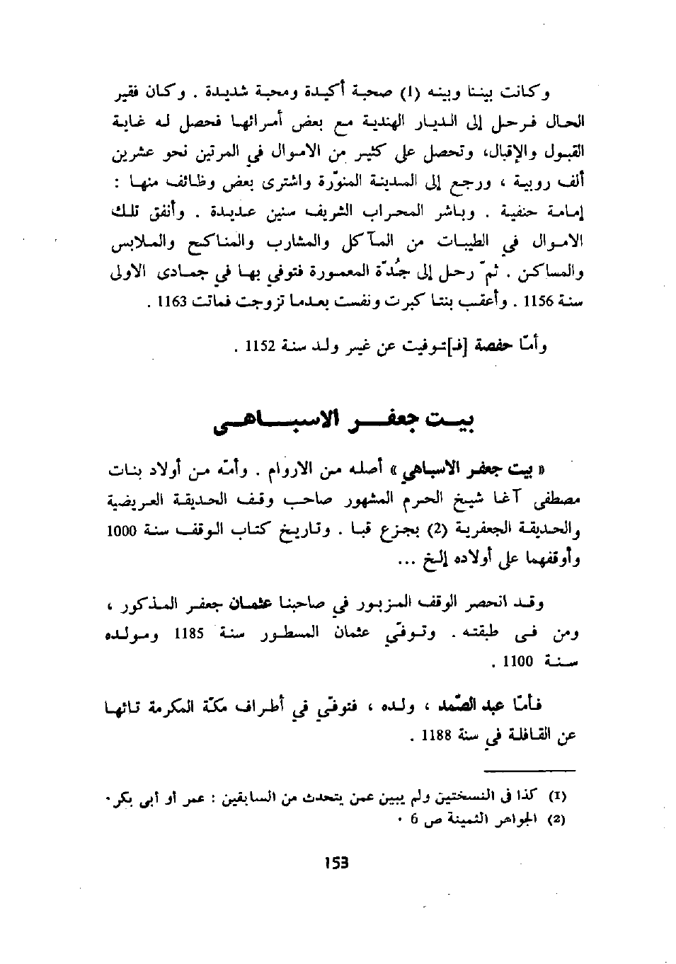 " بيت جعفر الأسباهي " أصله من الأروام. وأمه من أولاد بنات مصطفى آغا شيخ الحرم المشهور صاحب وقف الحديقة العريضية والحديقة الجعفرية بجزع قبا. وتاريخ كتاب الوقف سنة 1000 وأوقفهما على أولاده الخ ...
