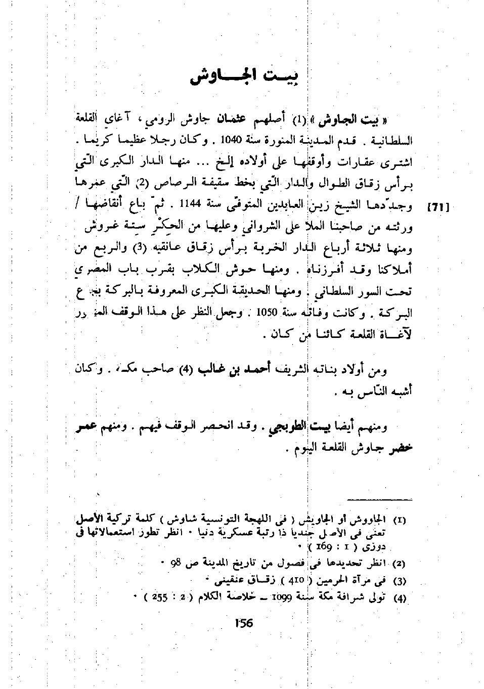 " بيت الجاوش " أصلهم عثمان جاوش الرومي، آغاي القلعة السلطانية. قدم المدينة المنورة سنة 1040. وكان رجلاً عظيماً كريماً. اشترى عقارات وأوقفها على أولاده الخ ... منها الدار الكبرى التي برأس زقاق الطوال والدار التي بخط سقيفة الرصاص التي عمرها وجددها الشيخ زين العابدين المتوفى سنة 1144. ثم باع أنقاضها ورثته من صاحبنا الملا على الشرواني وعليها من الحكر ستة غروش ومنها ثلاثة أرباع الدار الخربة برأس زقاق عانقيه والربع من أملاكنا وقد أفرزناه. ومنها حوش الكلاب بقرب باب المصري تحت السور السلطاني. ومنها الحديقة الكبرى المعروفة بالبركة بجزع البركة. وكانت وفاته سنة 1050. وجعل النظر على هذا الوقف المزبور لآغاة القلعة كائناً من كان.