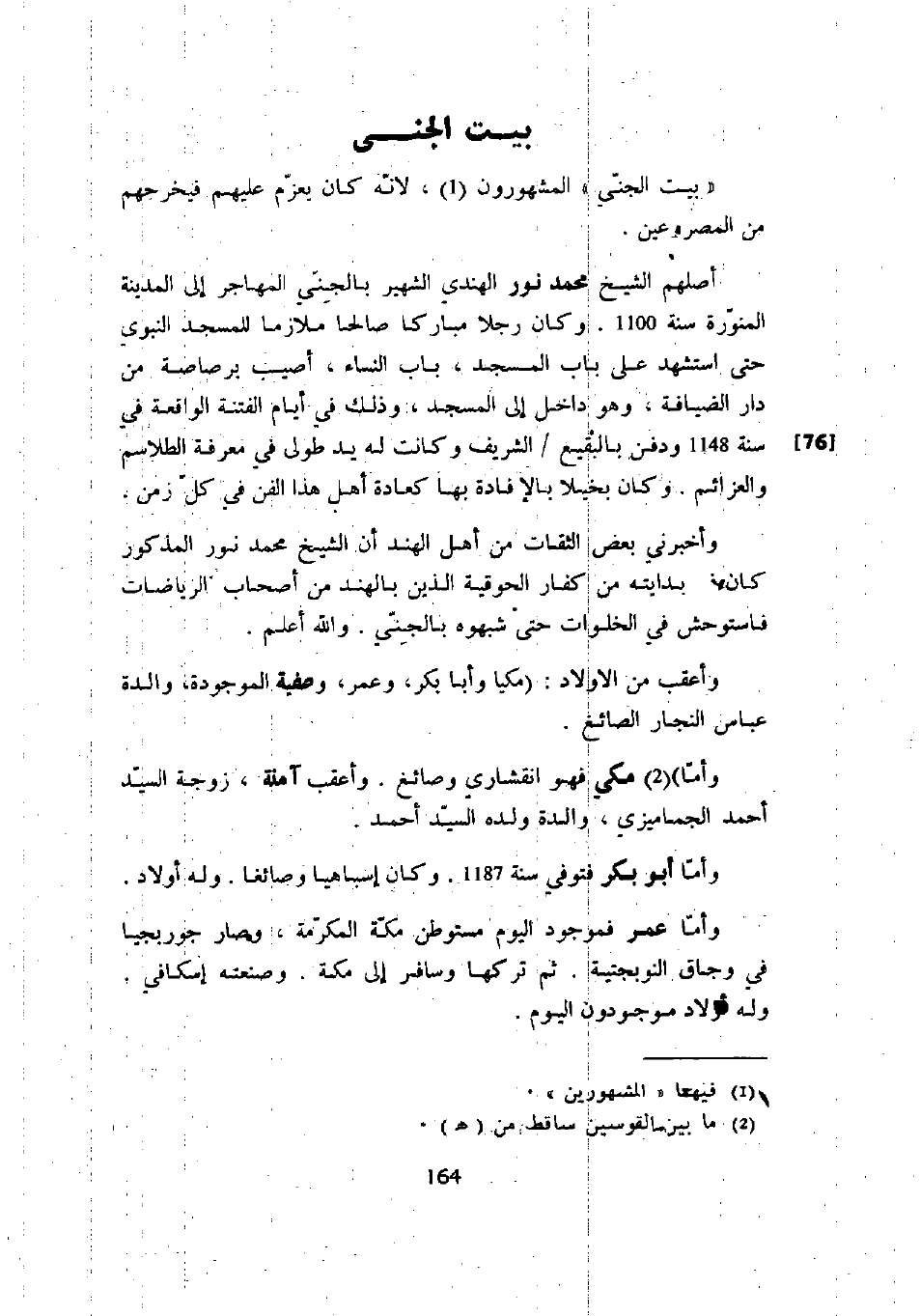 أصلهم الشيخ محمد نور الهندي الشهير بالجني المهاجر إلى المدينة المنورة سنة 1100. وكان رجلاً مباركاً صالحاً ملازماً للمسجد النبوي حتى استشهد على باب المسجد، باب النساء، أصيب برصاصة من دار الضيافة، وهو داخل إلى المسجد، وذلك في أيام الفتنة الواقعة في سنة 1148 ودفن بالبقيع الشريف وكانت له يد طولى في معرفة الطلاسم والعزائم. وكان بخيلاً بالإفادة بها كعادة أهل هذا الفن في كل زمن.
