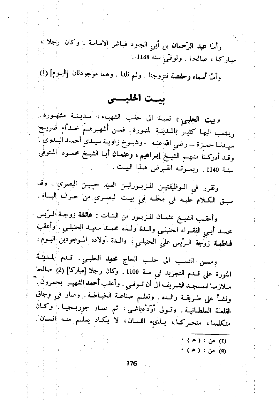 " بيت الحلبي " نسبة إلى حلب الشهباء، مدينة مشهورة. وينتسب إليها كثير بالمدينة المنورة. فمن أشهرهم خدام ضريح سيدنا حمزة - رضي الله عنه - وشيوخ زاوية سيدي أحمد البدوي. وقد أدركنا منهم الشيخ إبراهيم، وعثمان أبا الشيخ محمود المتوفى سنة 1140. وبموته انقرض هذا البيت.