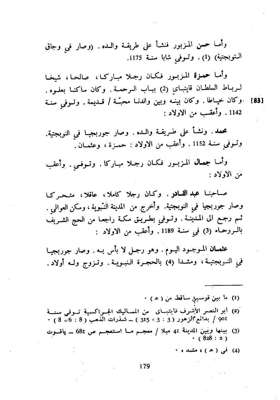 وأما جمال المزبور فكان رجلاً مباركاً. وتوفي. وأعقب من الأولاد: صاحبنا عبد القادر. وكان رجلاً كاملاً، عاقلاً، متحركاً وصار جوربجياً في النوبجتية. وأخرج من المدينة النبوية، وسكن العوالي. ثم رجع إلى المدينة. وتوفي بريق مكة راجعاً من الحج الشريف بالروحاء في سنة 1189. وأعقب من الأولاد: عثمان الموجود اليوم. وهو رجل لا بأس به. وصار جوربجياً في النوبجتية، ومشداً بالحجرة النبوية. وتزوج وله أولاد.