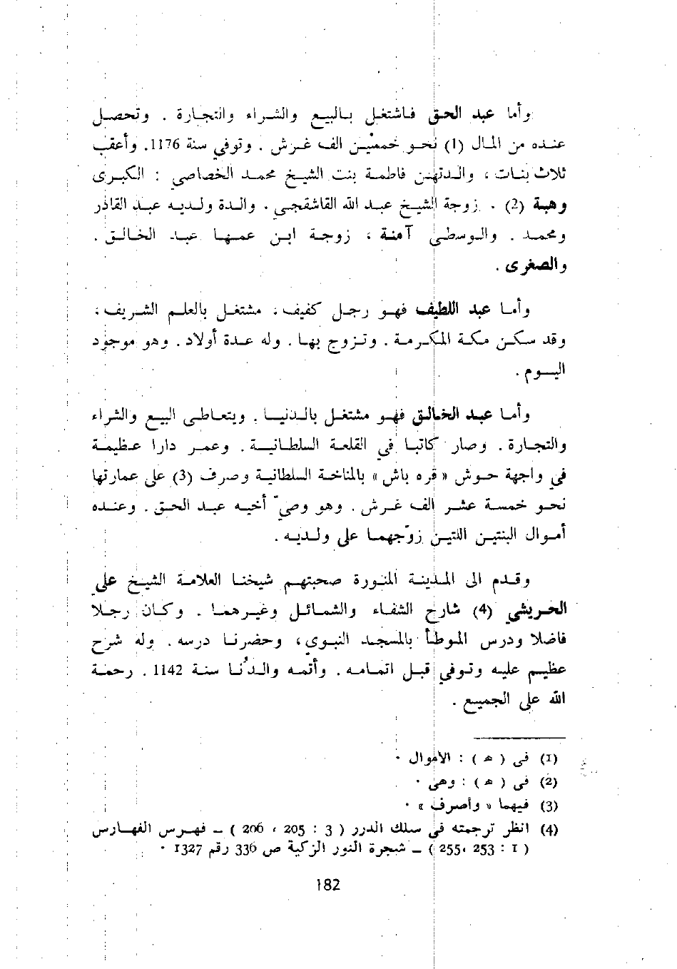 وأما عبد الخالق فهو مشتغل بالدنيا. ويتعاطى البيع والشراء والتجارة. وصار كاتباً في القلعة السلطانية. وعمر داراً عظيمة في واجهة حوش " قره باش " بالمناخة السلطانية وصرف على عمارتها نحو خمسة عشر ألف غرش. وهو وصي أخيه عبد الحق. وعنده أموال البنتين اللتين زوجهما على ولديه.