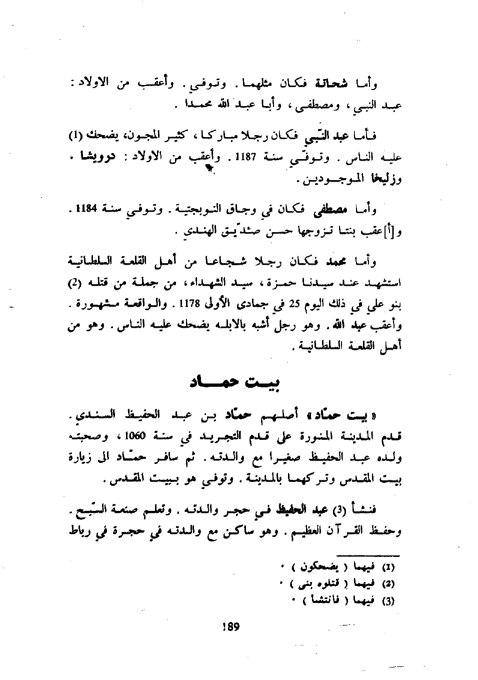 " بيت حماد " أصلهم حماد بن عبد الحفيظ السندي. قدم المدينة المنورة على قدم التجريد في سنة 1060، وصحبته ولده عبد الحفيظ صغيراً مع والدته. ثم سافر حماد إلى زيارة بيت المقدس وتركهما بالمدينة. وتوفي هو ببيت المقدس.