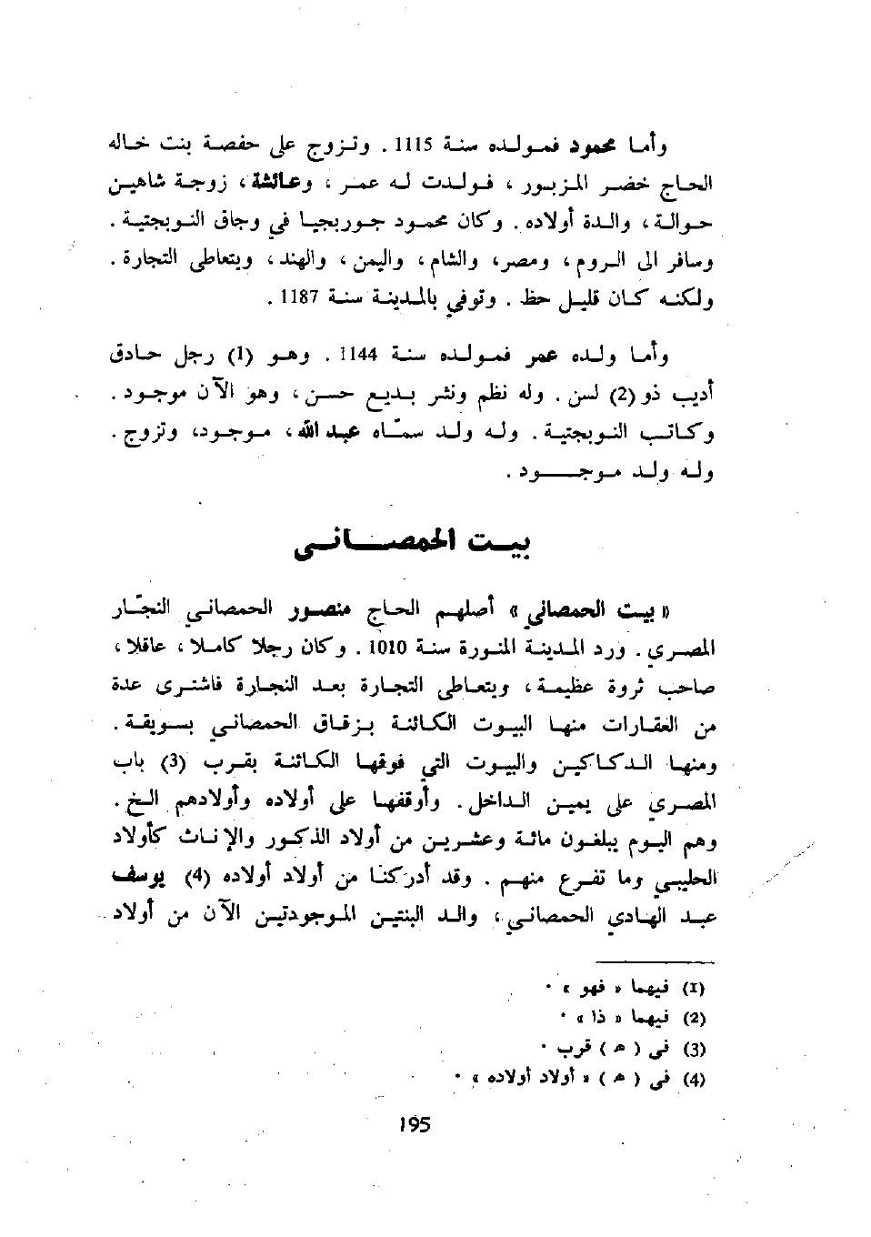 " بيت الحمصاني " أصلهم الحاج منصور الحمصاني النجار المصري. ورد المدينة المنورة سنة 1010. وكان رجلاً كاملاً، عاقلاً، صاحب ثروة عظيمة، ويتعاطى التجارة بعد النجارة فاشترى عدة من العقارات منها البيوت الكائنة بزقاق الحمصاني بسويقة. ومنها الدكاكين والبيوت التي فوقها الكائنة بقرب باب المصري على يمين الداخل. وأوقفها على أولاده وأولادهم الخ. وهم اليوم يبلغون مائة وعشرين من أولاد الذكور والإناث كأولاد الحليبي وما تفرغ منهم. وقد أدركنا من أولاد أولاده يوسف عبد الهادي الحمصاني، والد البنتين الموجودتين الآن من أولاد