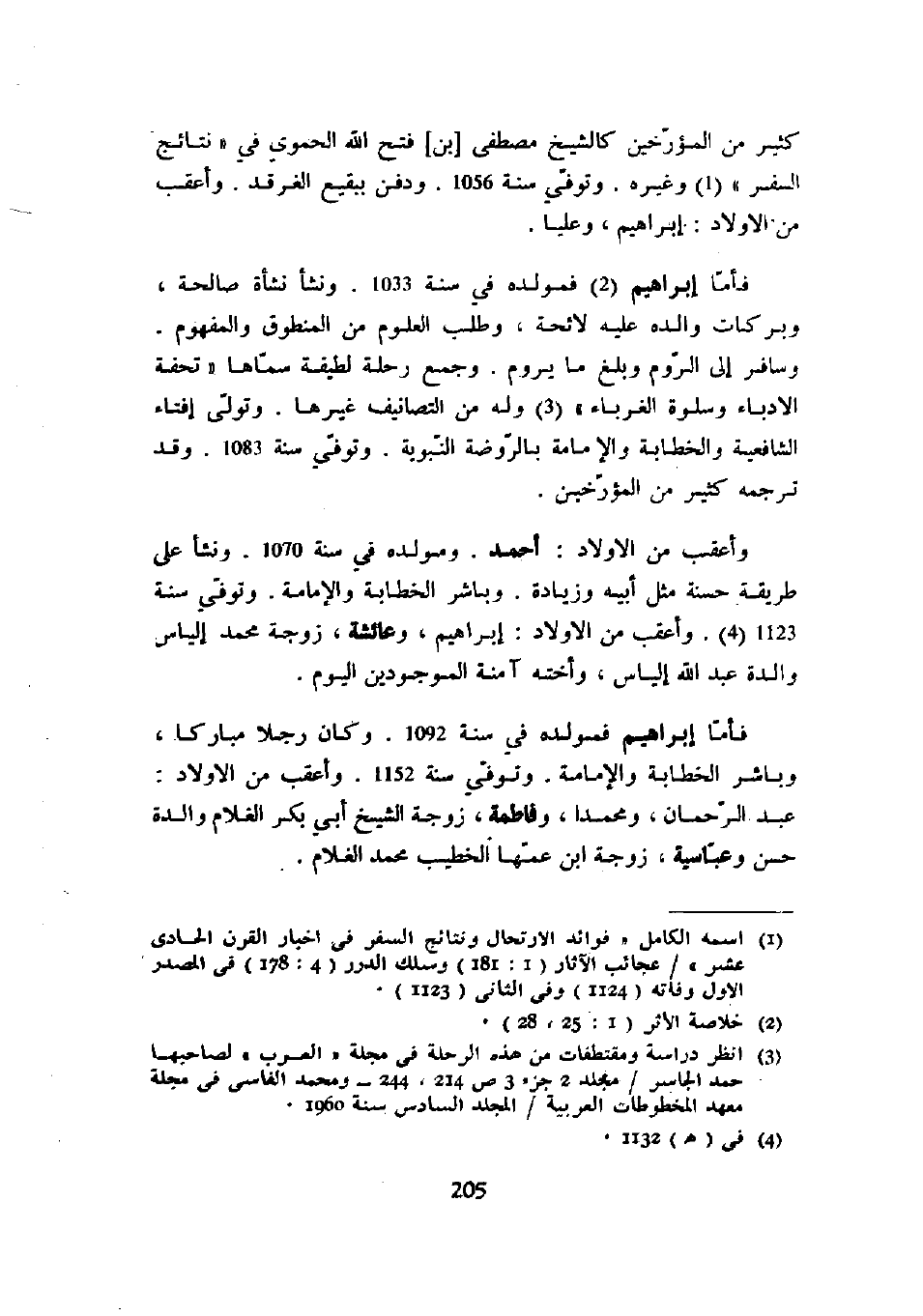 فأما إبراهيم فمولده في سنة 1033. ونشأ نشأة صالحة، وبركات والده عليه لائحة، وطلب العلوم من المنطوق والمفهوم. وسافر إلى الروم وبلغ ما يروم. وجمع رحلة لطيفة سماها " تحفة الأدباء وسلوة الغرباء " وله من التصانيف غيرها. وتولى إفتاء الشافعية والخطابة والإمامة بالروضة النبوية. وتوفي سنة 1083. وقد ترجمه كثير من المؤرخين.