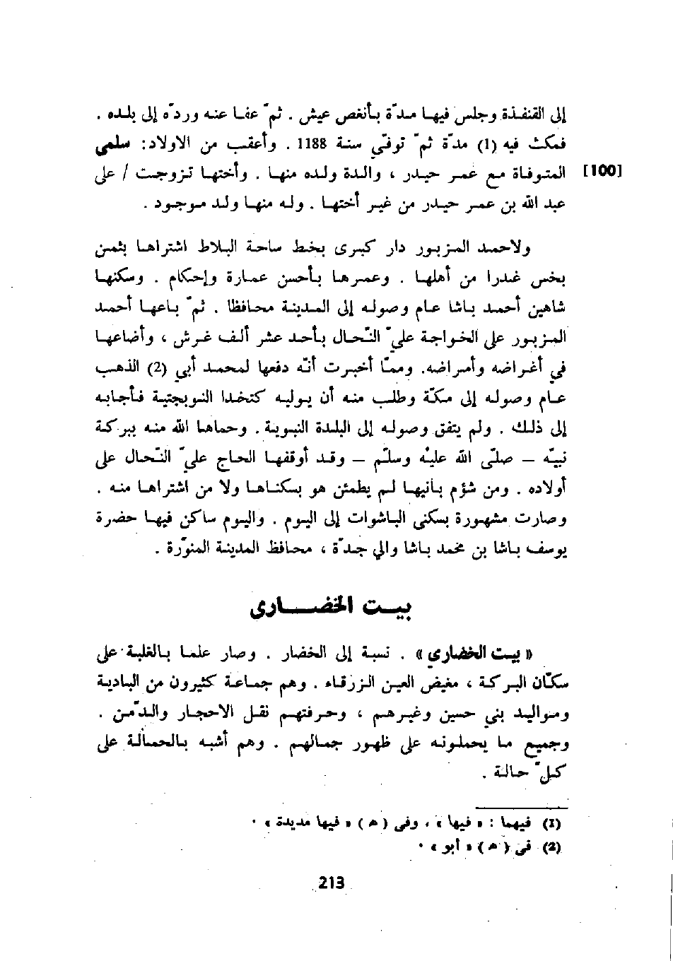 " بيت الخضاري ". نسبة إلى الخضار. وصار علماً بالغلبة على سكان البركة، مغيض العين الزرقاء. وهم جماعة كثيرون من البادية ومواليد بني حسين وغيرهم، وحرفتهم نقل الأحجار والدمن. وجميع ما يحملونه على ظهور جمالهم. وهم أشبه بالحمالة على كل حالة.