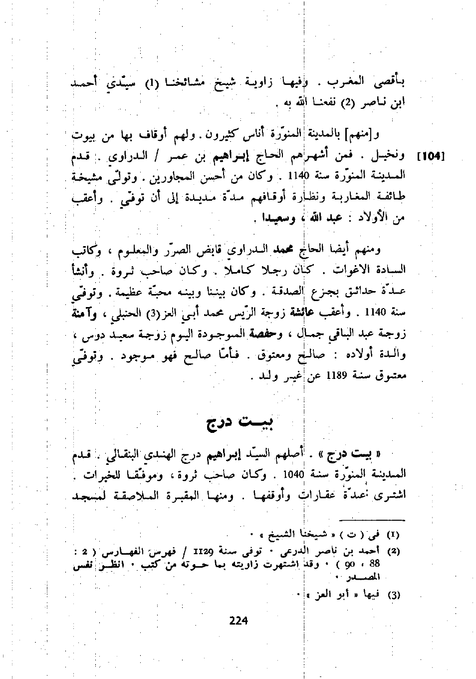 و" منهم " بالمدينة المنورة أناس كثيرون. ولهم أوقاف بها من بيوت ونخيل. فمن أشهرهم الحاج إبراهيم بن عمر الدراوي. قدم المدينة المنورة سنة 1140. وكان من أحسن المجاورين. وتولى مشيخة طائفة المغاربة ونظارة أوقافهم مدة مديدة إلى أن توفي. وأعقب من الأولاد: عبد الله، وسعيداً.