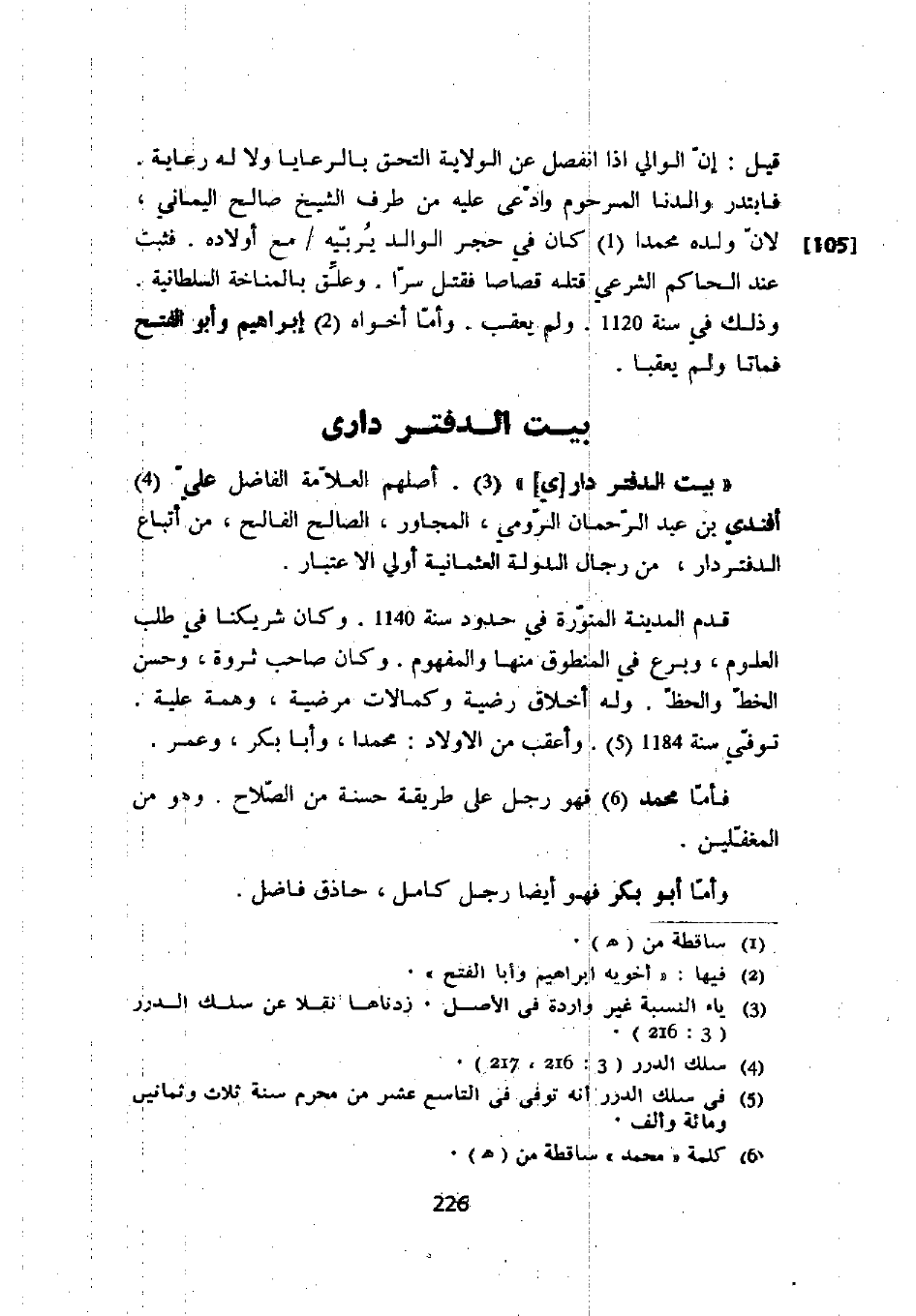 " بيت الدفتردار " ي " ". أصلهم العلامة الفاضل علي أفندي بن عبد الرحمان الرومي، المجاور، الصالح الفالح، من أتباع الدفتردار، من رجال الدولة العثمانية أولي الاعتبار.