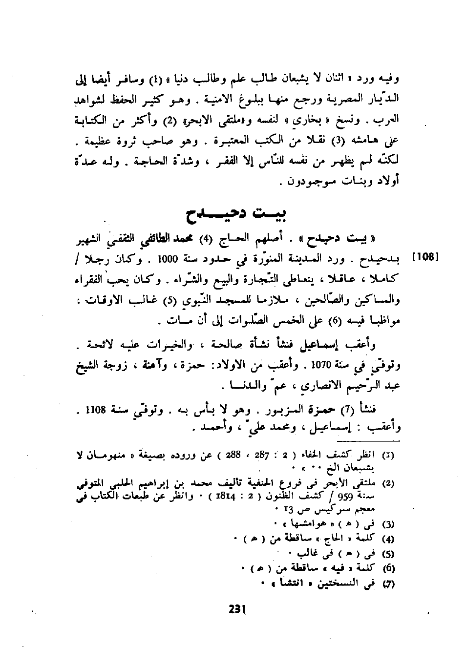 " بيت دحيدح ". أصلهم الحاج محمد الطائفي الثقفي الشهير بدحيدح. ورد المدينة المنورة في حدود سنة 1000. وكان رجلاً كاملاً، عاقلاً، يتعاطى التجارة والبيع والشراء. وكان يحب الفقراء والمساكين والصالحين، ملازماً للمسجد النبوي غالب الأوقات، مواظباً فيه على الخمس الصلوات إلى أن مات.