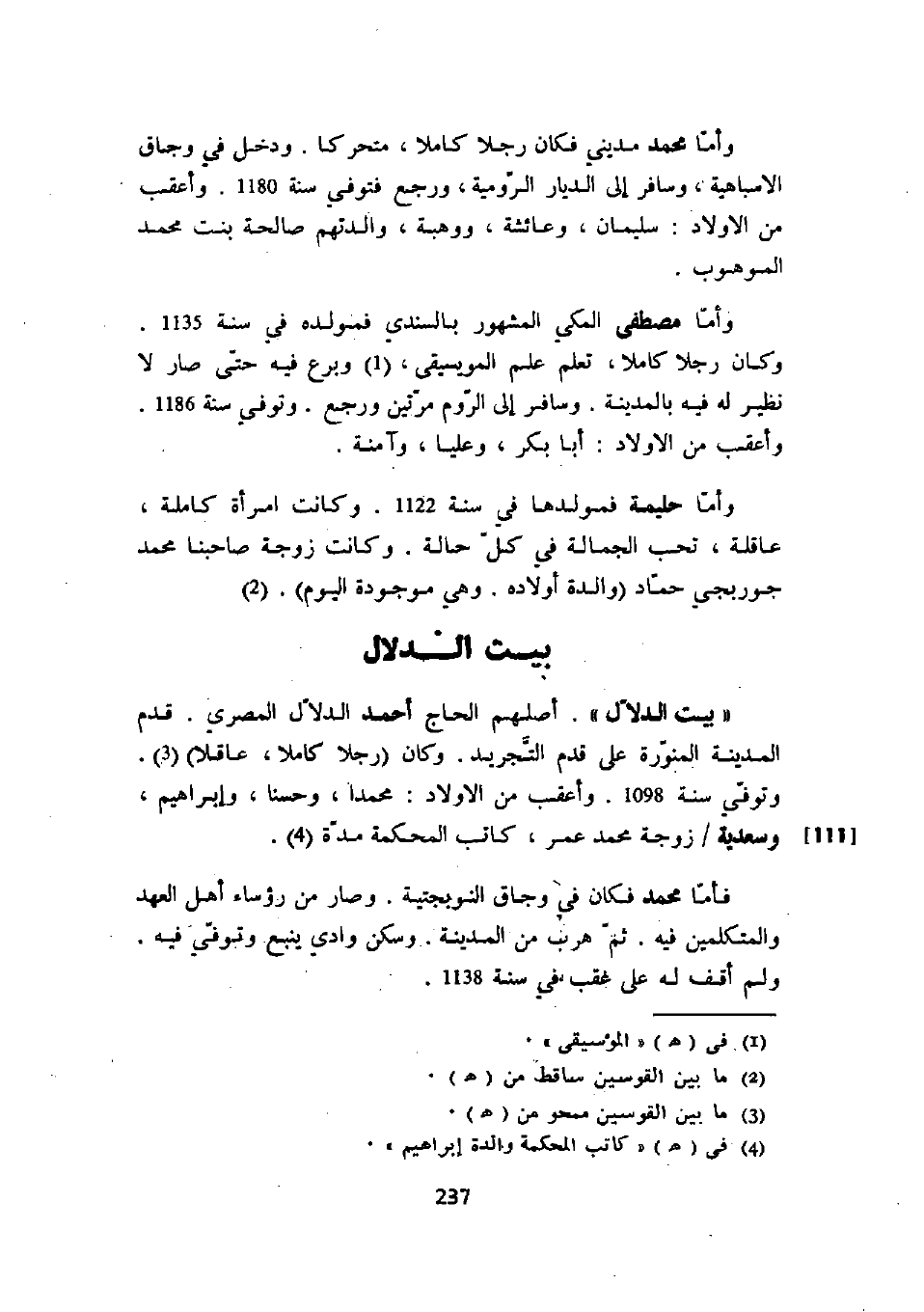 فأما محمد فكان في وجاق النوبجتية. وصار من رؤساء أهل العهد والمتكلمين فيه. ثم هرب من المدينة. وسكن وادي ينبع وتوفي فيه. ولم أقف له على عقب في سنة 1138.
