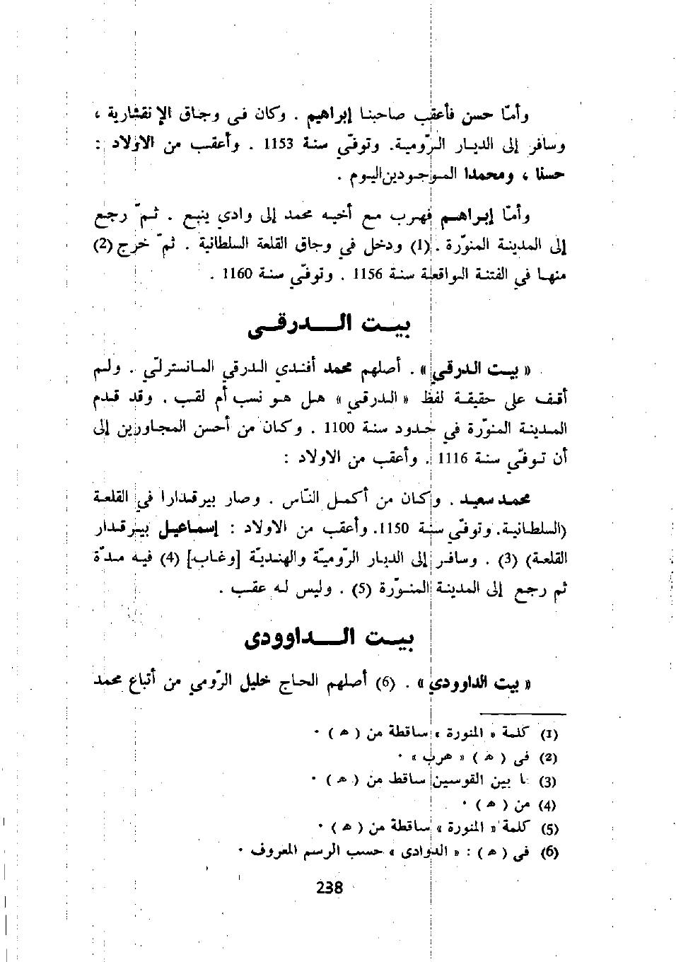 " بيت الدرقي ". أصلهم محمد أفندي الدرقي المانسترلي. ولم أقف على حقيقة لفظ " الدرقي " هل هو نسب أم لقب. وقد قدم المدينة المنورة في حدود سنة 1100. وكان من أحسن المجاورين إلى أن توفي سنة 1116. وأعقب من الأولاد:
