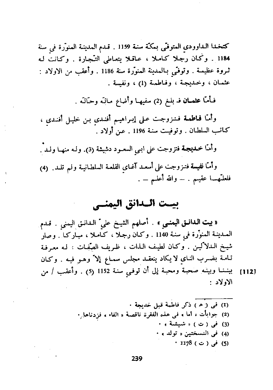 " بيت الدانق اليمني ". أصلهم الشيخ علي الدانق اليمني. قدم المدينة المنورة في سنة 1140. وكان رجلاً، كاملاً، مباركاً. وصار شيخ الدلالين. وكان لطيف الذات، ظريف الصفات، له معرفة تامة بضرب الناي لا يكاد ينعقد مجلس سماع إلا وهو فيه. وكان بيننا وبينه صحبة ومحبة إلى أن توفي سنة 1152. وأعقب من الأولاد: