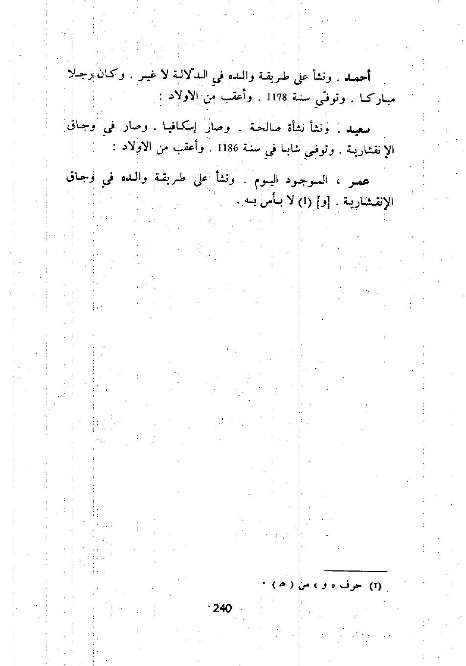 أحمد. ونشأ على طريقة والده في الدلالة لا غير. وكان رجلاً مباركاً. وتوفي سنة 1178. وأعقب من الأولاد: سعيد. ونشأ نشأة صالحة. وصار إسكافياً. وصار في وجاق الإنقشارية. وتوفي شاباً في سنة 1186. وأعقب من الأولاد: عمر، الموجود اليوم. ونشأ على طريقة والده في وجاق الإنقشارية. " و " لا بأس به.