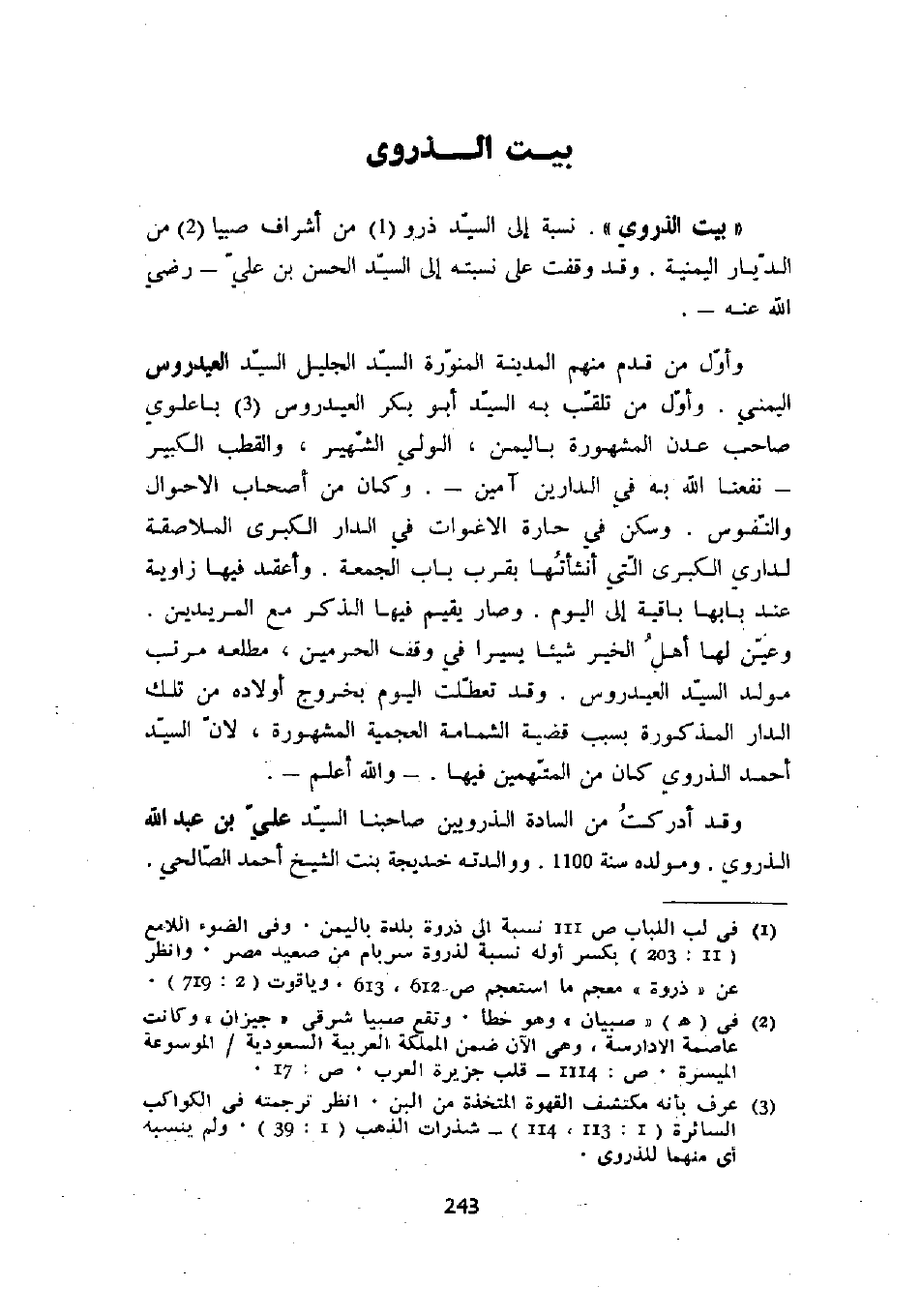 " بيت الذروي ". نسبة إلى السيد ذرو من أشراف صبيا من الديار اليمنية. وقد وقفت على نسبته إلى السيد الحسن بن علي - رضي الله عنه -.