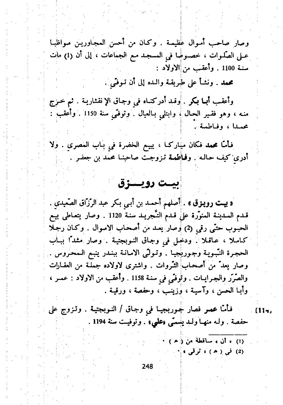 " بيت رويزق ". أصلهم أحمد بن أبي بكر عبد الرزاق الصعيدي. قدم المدينة المنورة على قدم التجريد سنة 1120. وصار يتعاطى بيع الحبوب حتى رقي وصار يعد من أصحاب الأموال. وكان رجلاً كاملاً، عاقلاً. ودخل في وجاق النوبجتية. وصار مشداً بباب الحجرة النبوية وجوربجياً. وتولى الأمانة ببندر ينبع المحروس. وصار يعد من أصحاب الثروات. واشترى لأولاده جملة من العقارات والصرر والجرايات. وتوفي سنة 1158. وأعقب من الأولاد: عمر، وأبا الحسن، وآسية، وزينب، وحفصة، ورقية.