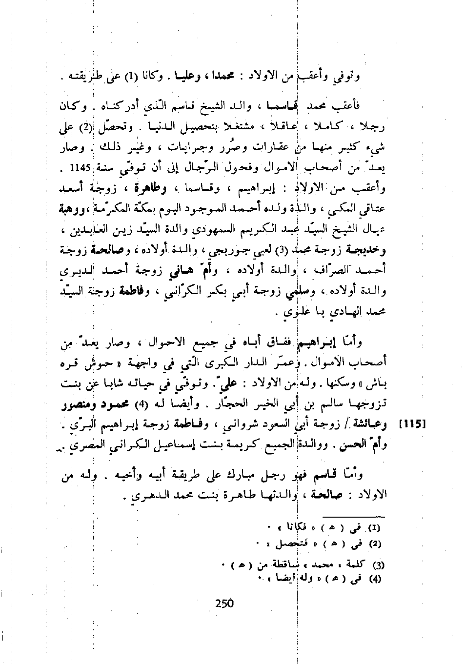 وتوفي وأعقب من الأولاد: محمداً، وعلياً. وكانا على طريقته. فأعقب محمد قاسماً، والد الشيخ قاسم الذي أدركناه. وكان رجلاً، كاملاً، عاقلاً، مشتغلاً بتحصيل الدنيا. وتحصل على شيء كثير منها من عقارات وصرر وجرايات، وغير ذلك. وصار يعد من أصحاب الأموال وفحول الرجال إلى أن توفي سنة 1145. وأعقب من الأولاد: إبراهيم، وقاسماً، وطاهرة، زوجة أسعد عتاقي المكي، والدة ولده أحمد الموجود اليوم بمكة المكرمة، ووهبة عيال الشيخ السيد عبد الكريم السمهودي والدة السيد زين العابدين، وخديجة زوجة محمد لعبي جوربجي، والدة أولاده، وأم هانئ زوجة أحمد الديري والدة أولاده، وسلمى زوجة أبك بكر الكراني، وفاطمة زوجة السيد محمد الهادي باعلوي.