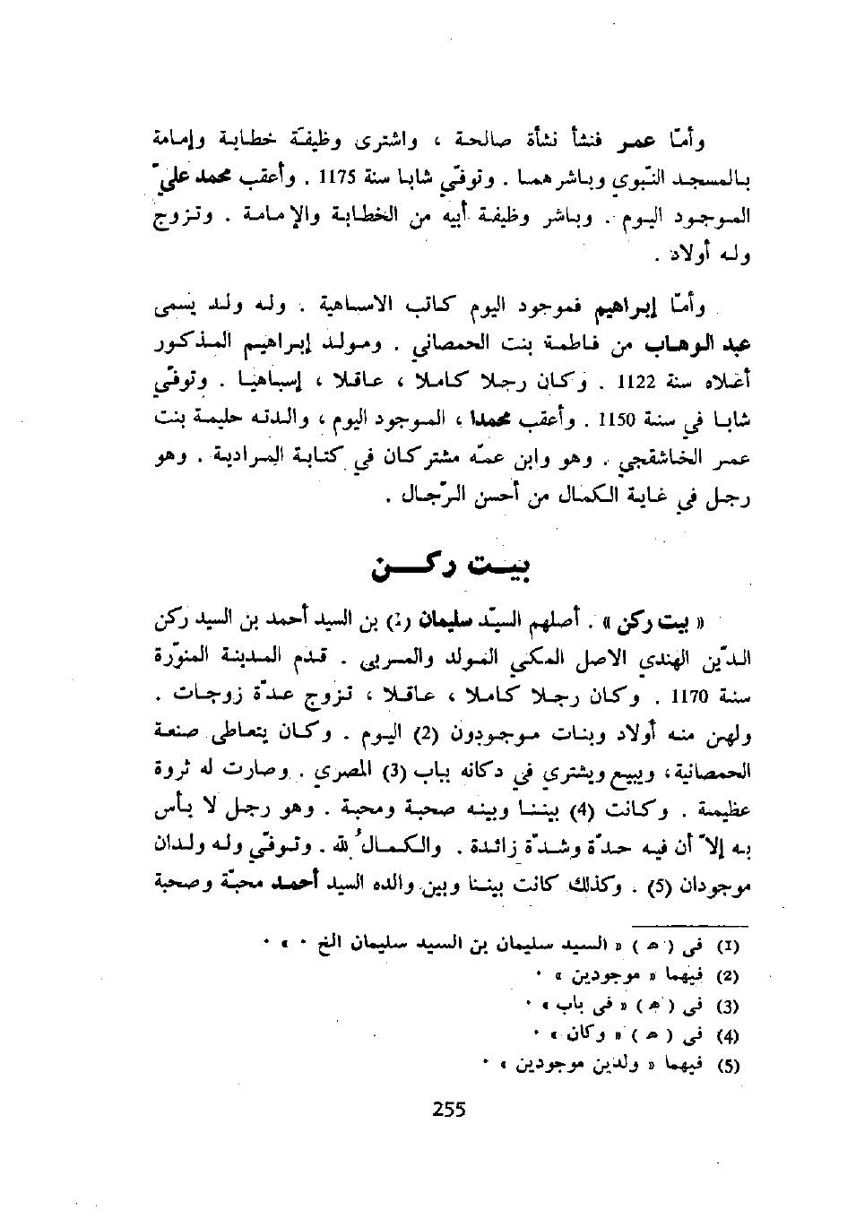 " بيت ركن ". أصلهم السيد سليمان بن السيد أحمد بن السيد ركن الدين الهندي الأصل المكي المولد والمربى. قدم المدينة المنورة سنة 1170. وكان رجلاً كاملاً، عاقلاً، تزوج عدة زوجات. ولهم منه أولاد وبنات موجودون اليوم. وكان يتعاطى صنعة الحمصانية، ويبيع ويشتري في دكانه بباب المصري. وصارت له ثروة عظيمة. وكانت بيننا وبينه صحبة ومحبة. وهو رجل لا بأس به إلا أن فيه حدة وشدة زائدة. والكمال لله. وتوفي وله ولدان موجودان. وكذلك كانت بينا وبين والده السيد أحمد محبة وصحبة
