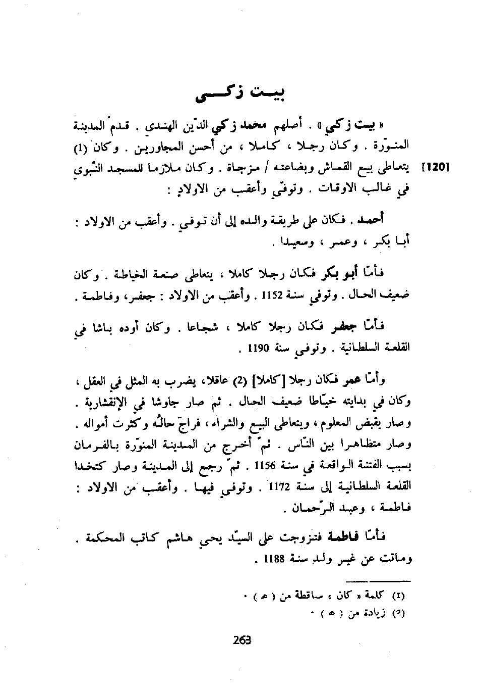 " بيت زكي ". أصلهم محمد زكي الدين الهندي. قدم المدينة المنورة. وكان رجلاً، كاملاً، من أحسن المجاورين. وكان يتعاطى بيع القماش وبضاعته مزجاة. وكان ملازماً للمسجد النبوي في غالب الأوقات. وتوفي وأعقب من الأولاد: أحمد. فكان على طرقة والده إلى أن توفي. وأعقب من الأولاد: أبا بكر، وعمر، وسعيداً.