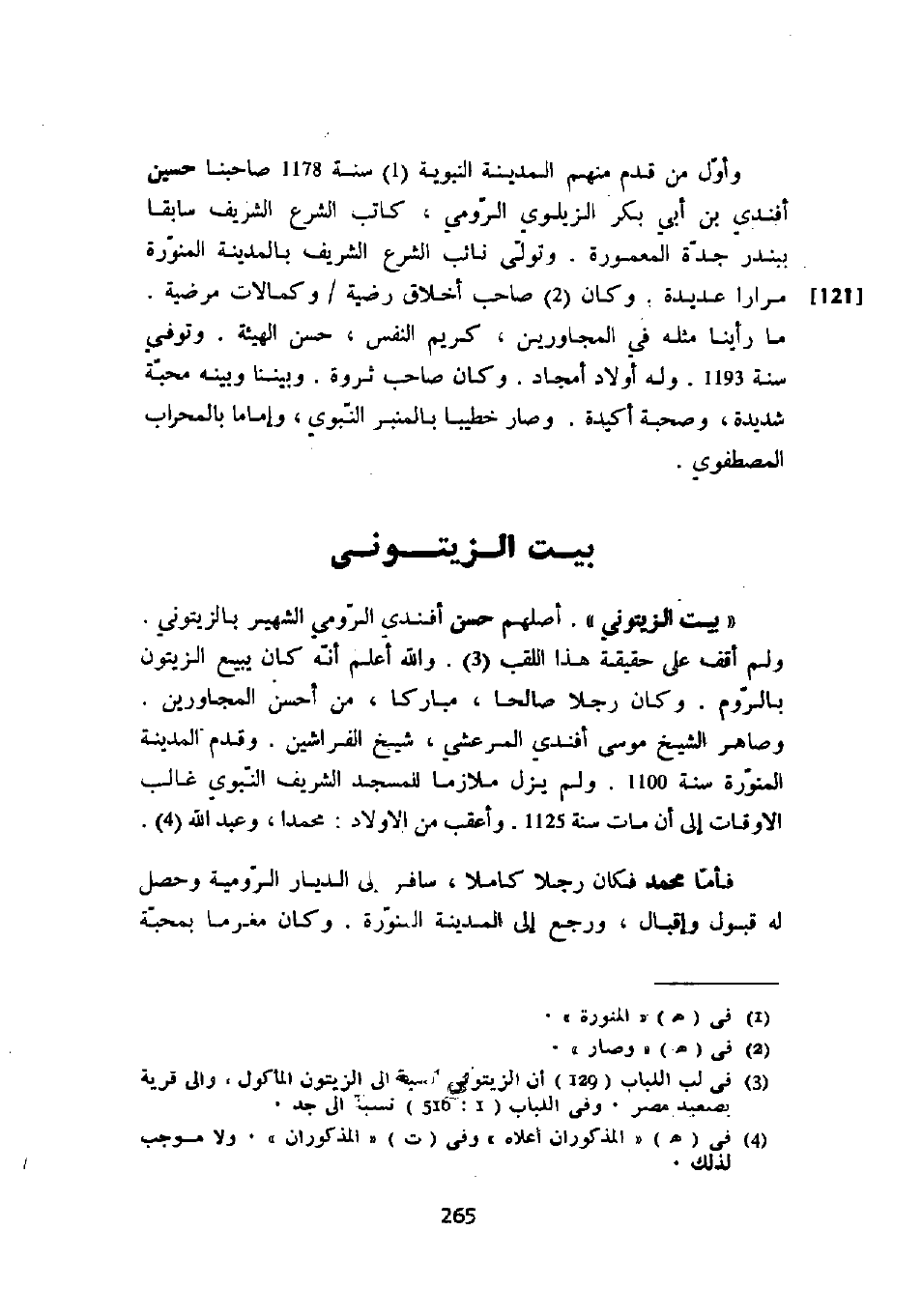 " بيت الزيتوني ". أصلهم حسن أفندي الرومي الشهير بالزيتوني. ولم أقف على حقيقة هذا اللقب. والله أعلم أنه كان يبيع الزيتون بالروم. وكان رجلاً صالحاً، مباركاً، من أحسن المجاورين. وصاهر الشيخ موسى أفندي المرعشي، شيخ الفراشين. وقدم المدينة المنورة سنة 1100. ولم يزل ملازماً للمسجد الشريف النبوي غالب الأوقات إلى أن مات سنة 1125. وأعقب من الأولاد: محمداً، وعبد الله.