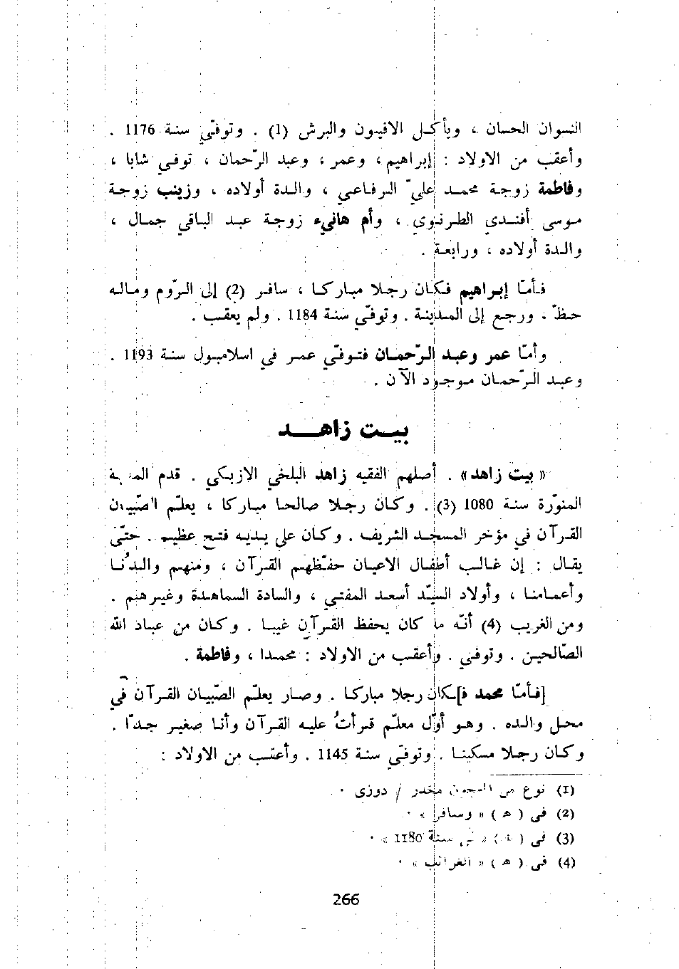 " بيت زاهد ". أصلهم الفقيه زاهد البلخي الأزبكي. قدم المدينة المنورة سنة 1080. وكان رجلاً صالحاً مباركاً، يعلم الصبيان القرآن في مؤخر المسجد الشريف. وكان على يديه فتح عظيم. حتى يقال: إن غالب أطفال الأعيان حفظهم القرآن، ومنهم والدنا وأعمامنا، وأولاد السيد أسعد المفتي، والسادة السماهدة وغيرهم. ومن الغريب أنه ما كان يحفظ القرآن غيباً. وكان من عباد الله الصالحين. وتوفي. وأعقب من الأولاد: محمداً، وفاطمة.