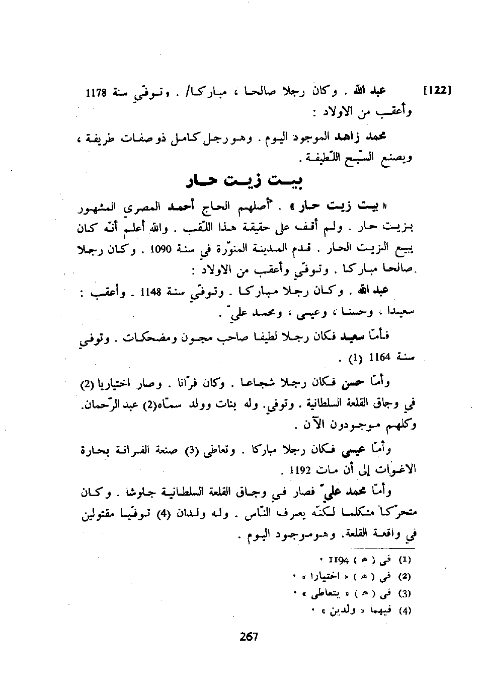 " بيت زيت حار ". أصلهم الحاج أحمد المصري المشهور بزيت حار. ولم أقف على حقيقة هذا اللقب. والله أعلم أنه كان يبيع الزيت الحار. قدم المدينة المنورة في سنة 1090. وكان رجلاً صالحاً مباركاً. وتوفي وأعقب من الأولاد: عبد الله. وكان رجلاً مباركاً. وتوفي سنة 1148. وأعقب: سعيداً، وحسناً، وعيسى، ومحمد علي.