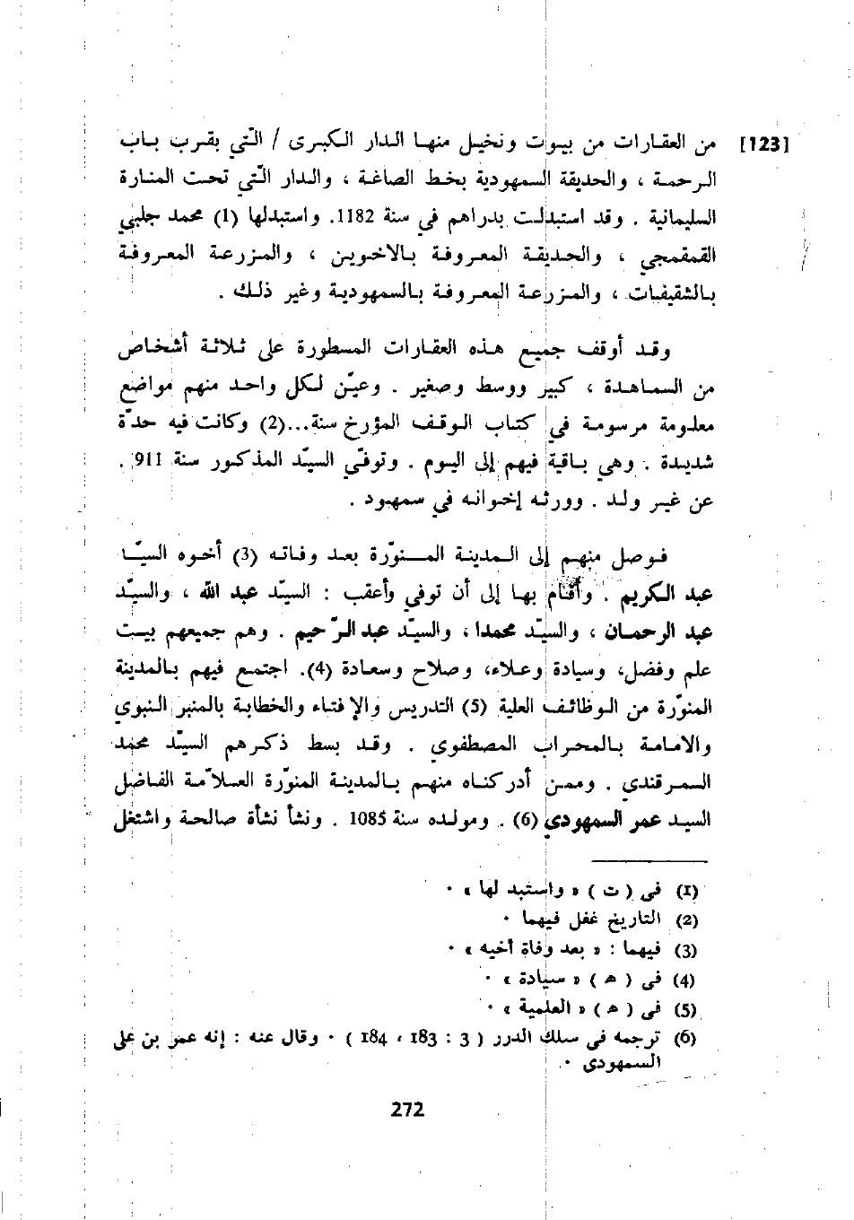 وقد أوقف جميع هذه العقارات المسطورة على ثلاثة أشخاص من السماهدة، كبير ووسط وصغير. وعين لكل واحد منهم مواضع معلومة مرسومة في كتاب الوقف المؤرخ سنة ... وكان فيه حدة شديدة. وهي باقية فيهم إلى اليوم. وتوفي السيد المذكور سنة 911. عن غير ولد. وورثه إخوانه في سمهود.